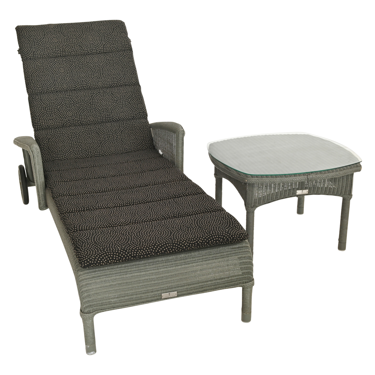 Both with woven frames, the chair with black polka dot pattern cushions, the table with glass top.