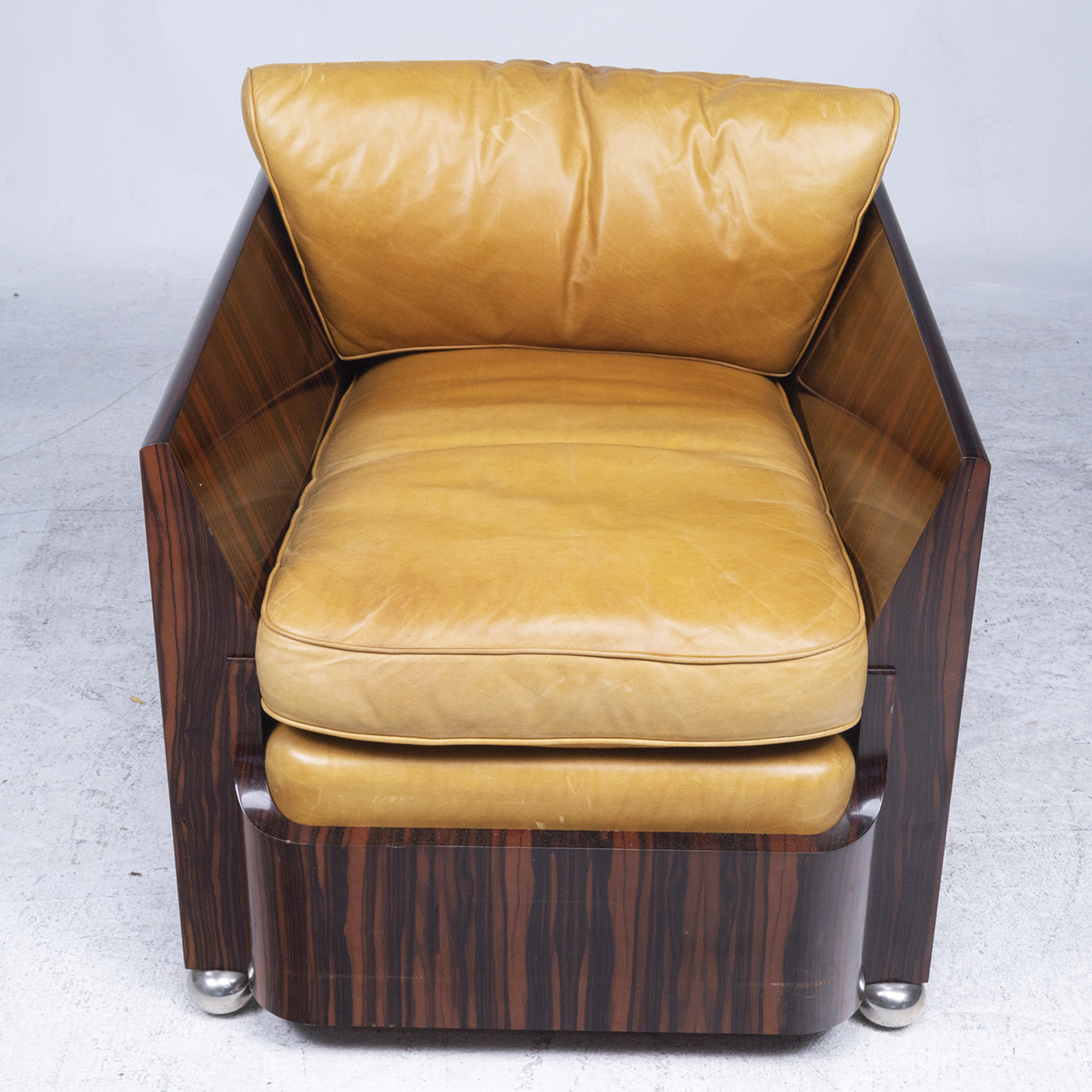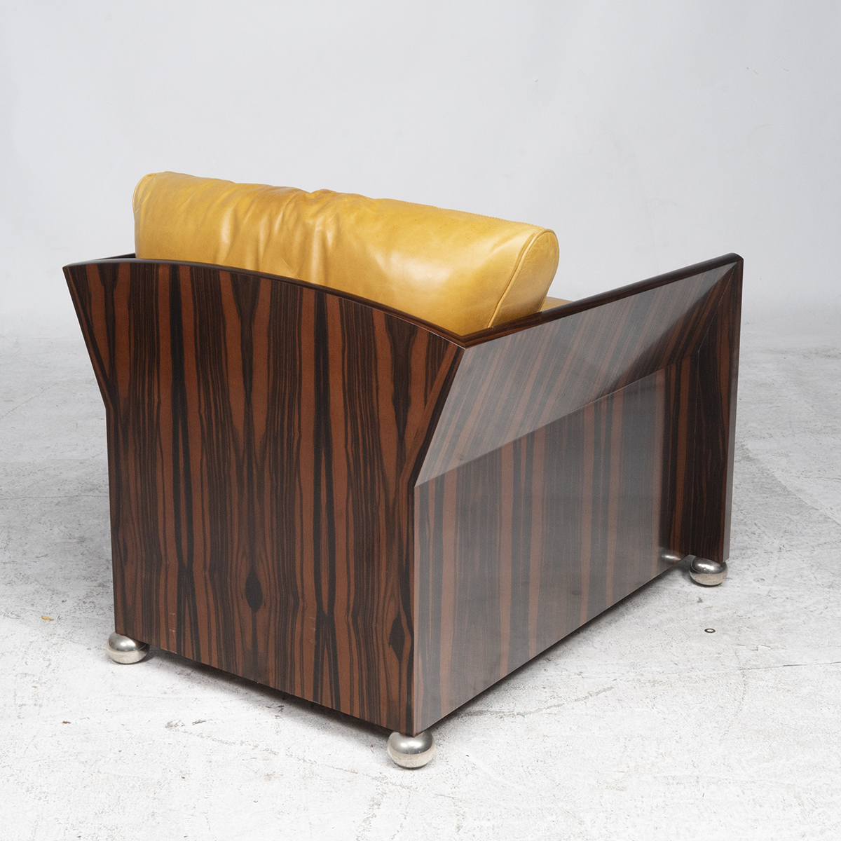 Macassar veneer body, light brown/orange leather upholstered cushions, round silver metal feet.