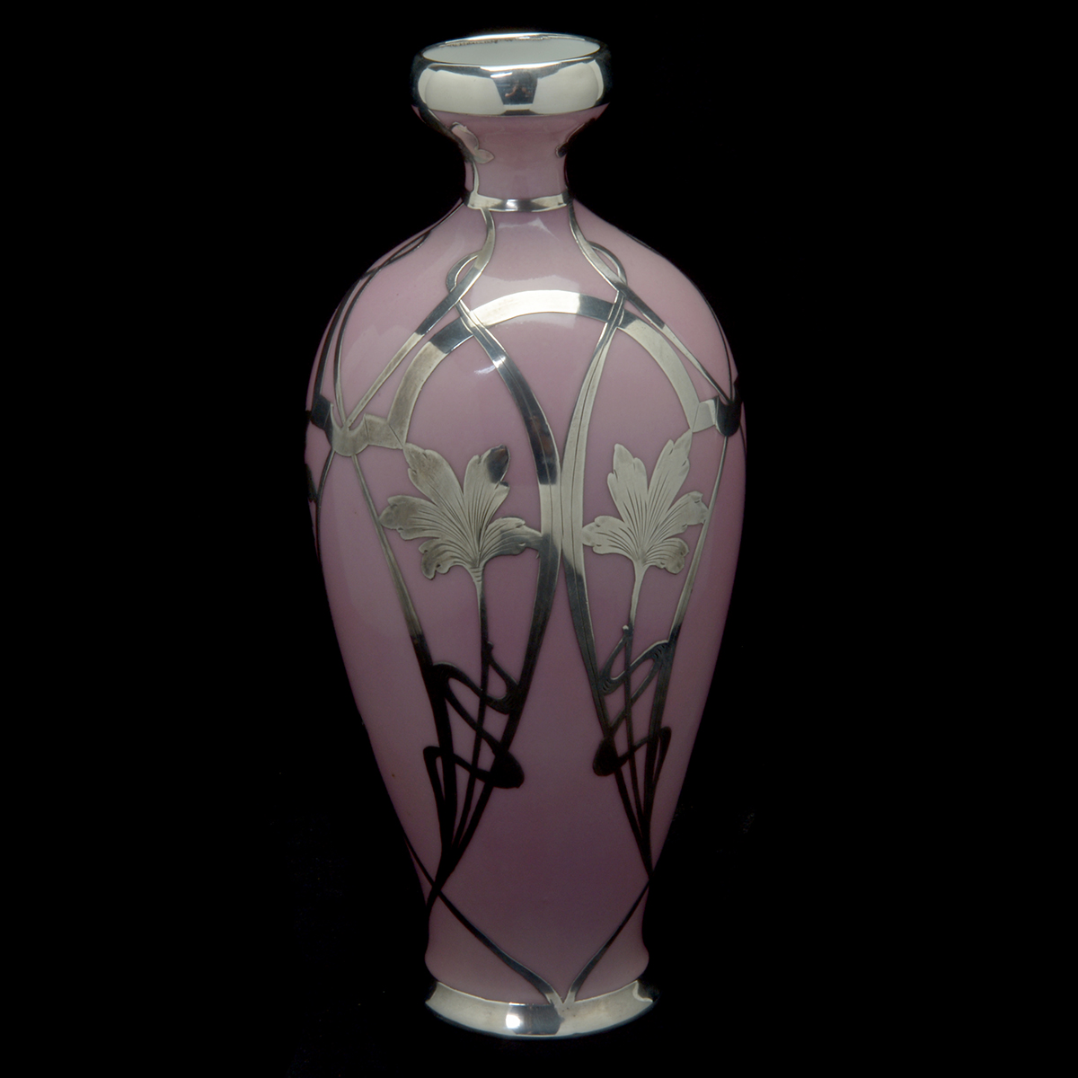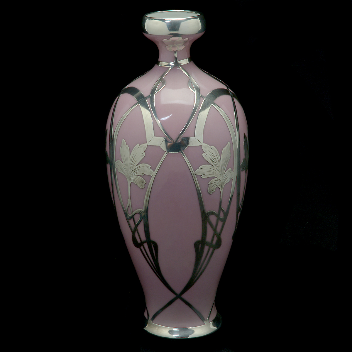 Interlaced silver overlay pattern on a soft pink ground.