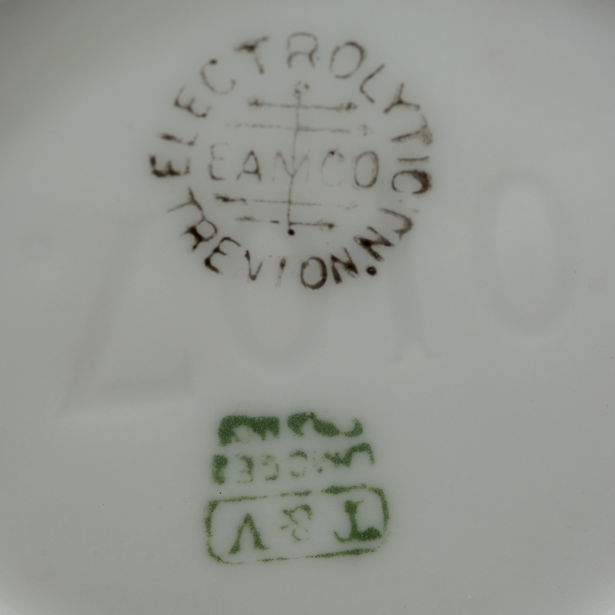 Markings to underside, TV Limoges France in green, Electrolytic Trenton NJ Eamco mark in black, 0107 impressed.