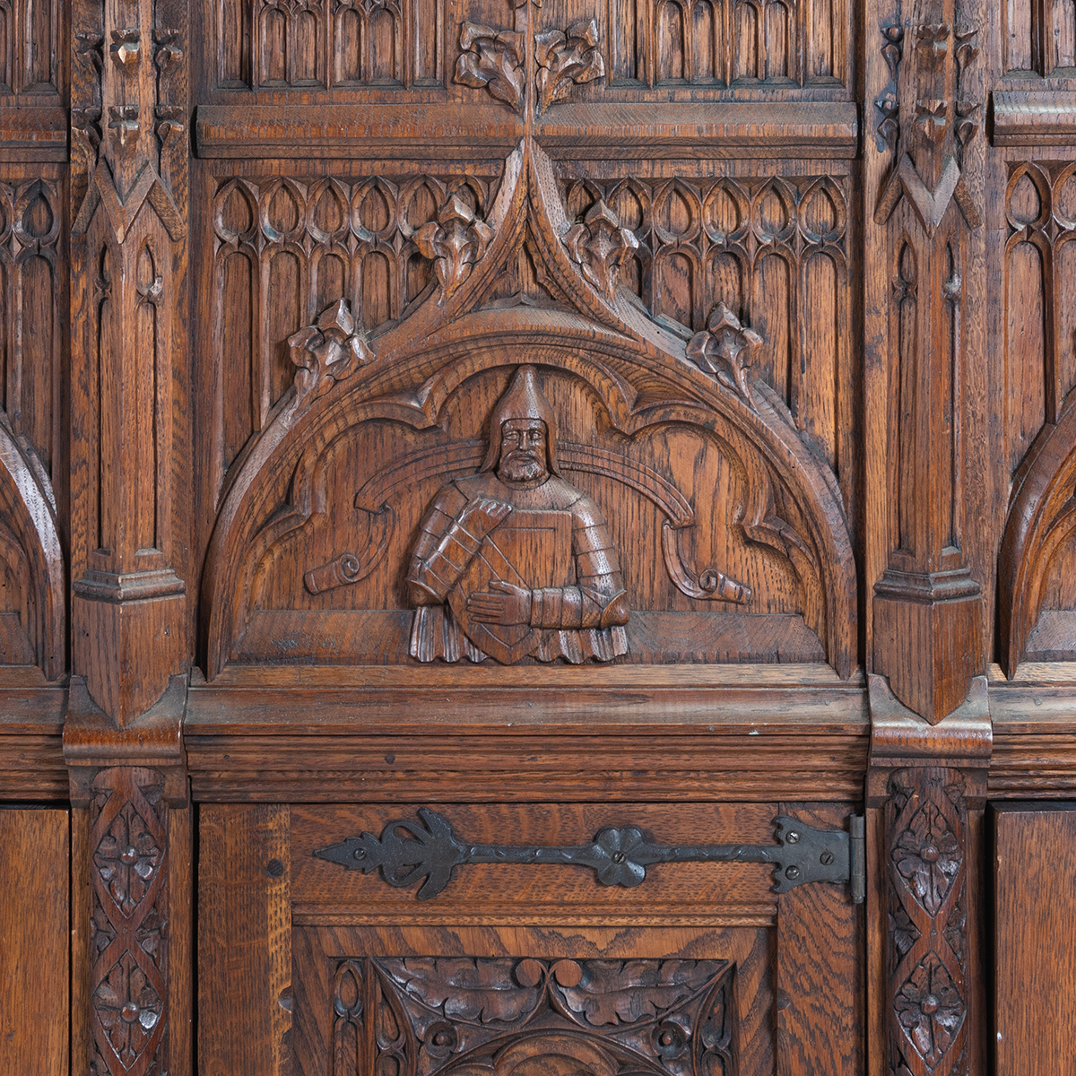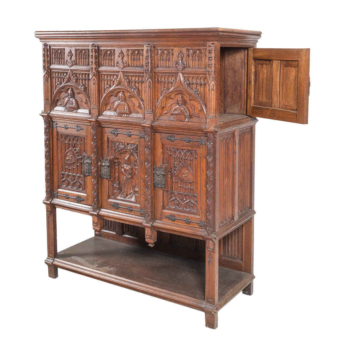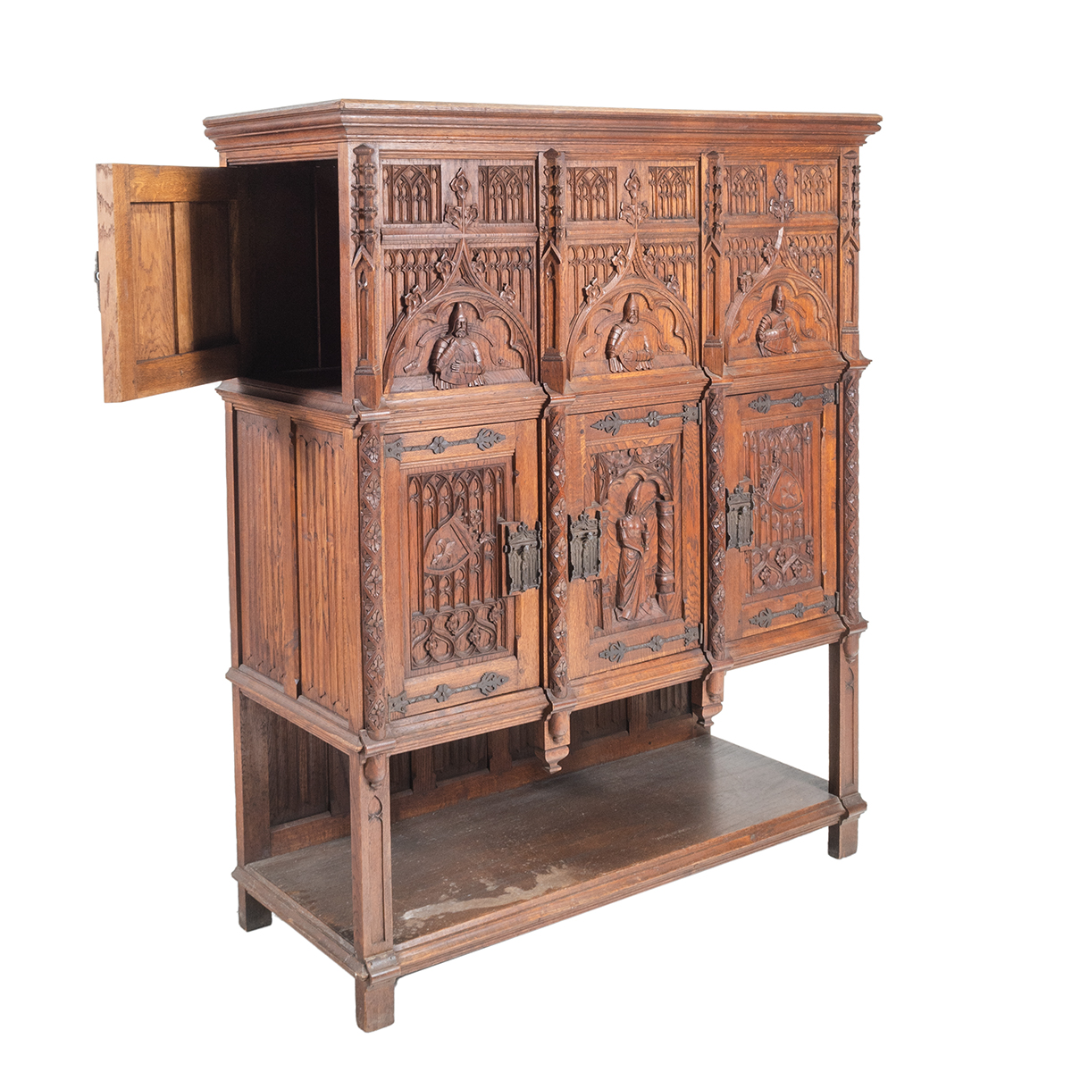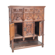 Two section cabinet, the top section with access doors to side, the lower section with three single cabinet doors, shelf storage to base the piece decorated with Gothic style figural carvings to door panels and additional gothic style carvings and hardware throughout.