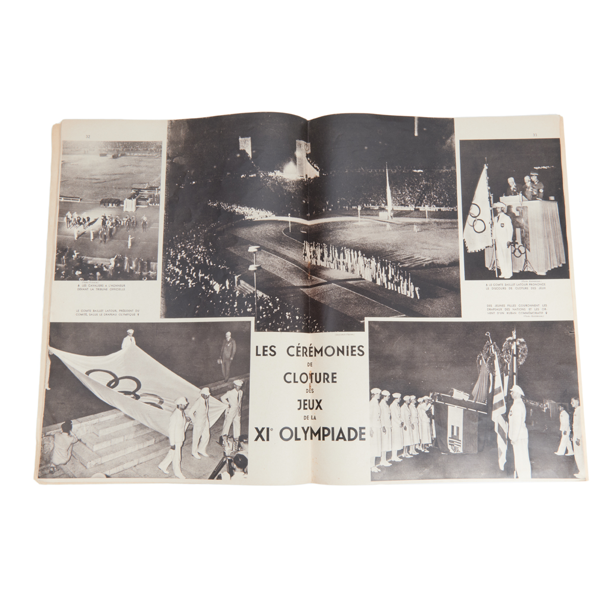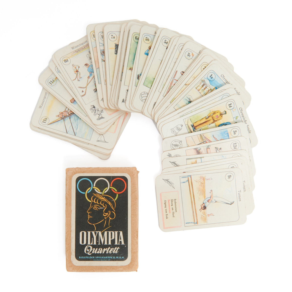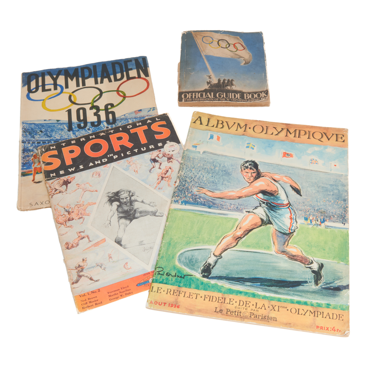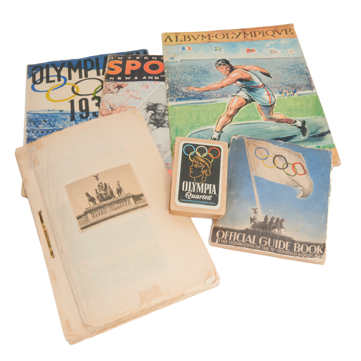 Comprising Bielefelder Spielkarten GMBH Olympia Quartett card game in box Official Guide Book scrapbook with German newspaper clippings Olympiaden 1936 i text och bild Saxon Lindstroms photo book International Sports in News and Pictures magazine Sep. 1932, and Album Olympique Le Petit Parisien photo book magazine.