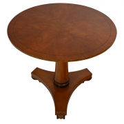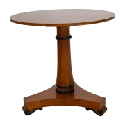 Round top on pedestal base, scrolled feet, parcel ebonized trim.