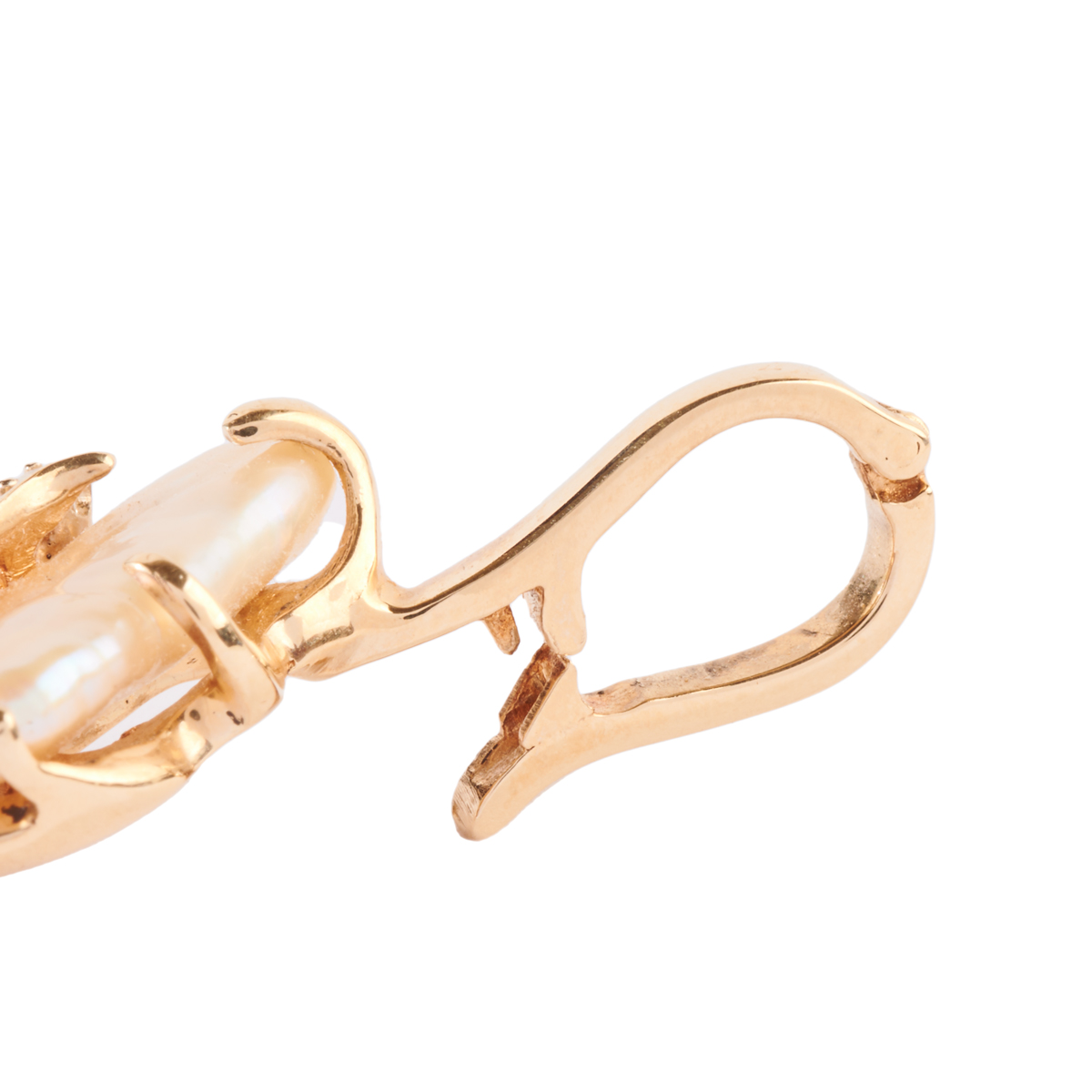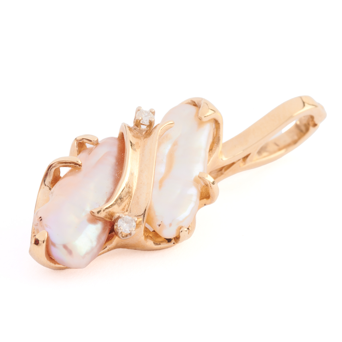 Including one biwa cultured pearl, diamond, 14k yellow gold pendant enhancer measuring approximately 40 x 16 mm together with one biwa cultured pearl, 14k yellow gold ring, size 8 1/4 (with insert).