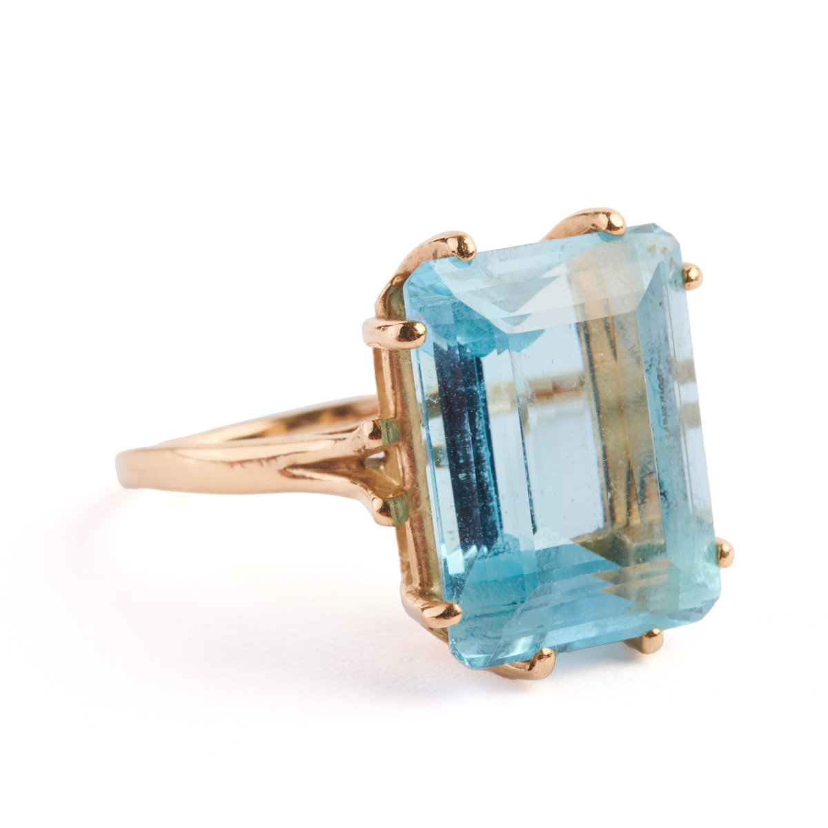 Featuring one emerald-cut blue topaz weighing approximately 14.10 cts., set in a 14k yellow gold mounting.