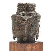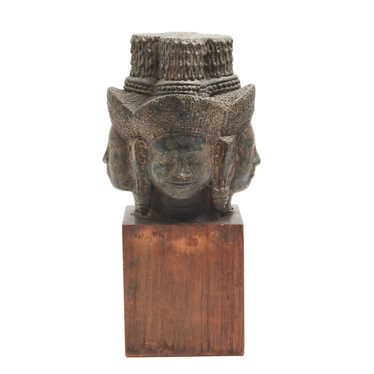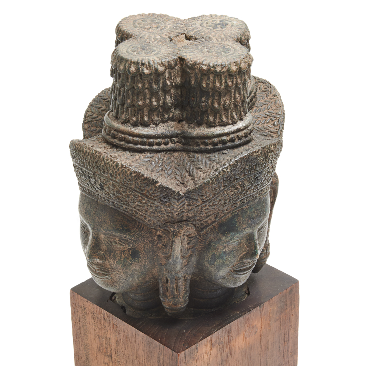 A detailed four-head buddha carved with smiling faces, full lips, and thin eyebrows, all staring in cardinal directions, each with traditional headdresses and long earlobes with jewelry, all connected by a towering chignon with lotus flowers at the top, surmounted on a wooden base.