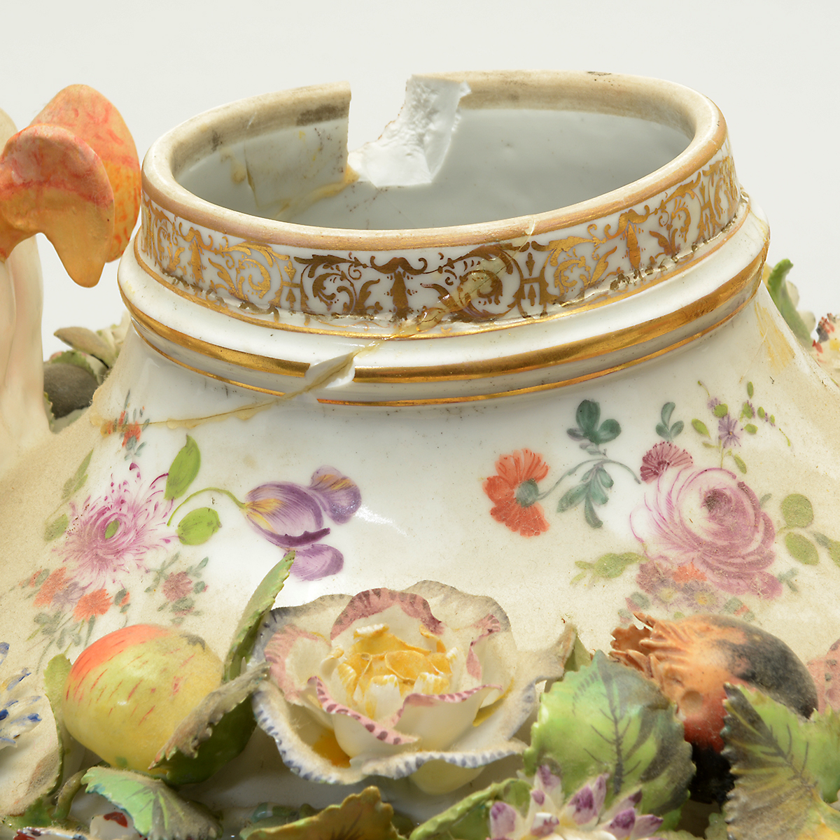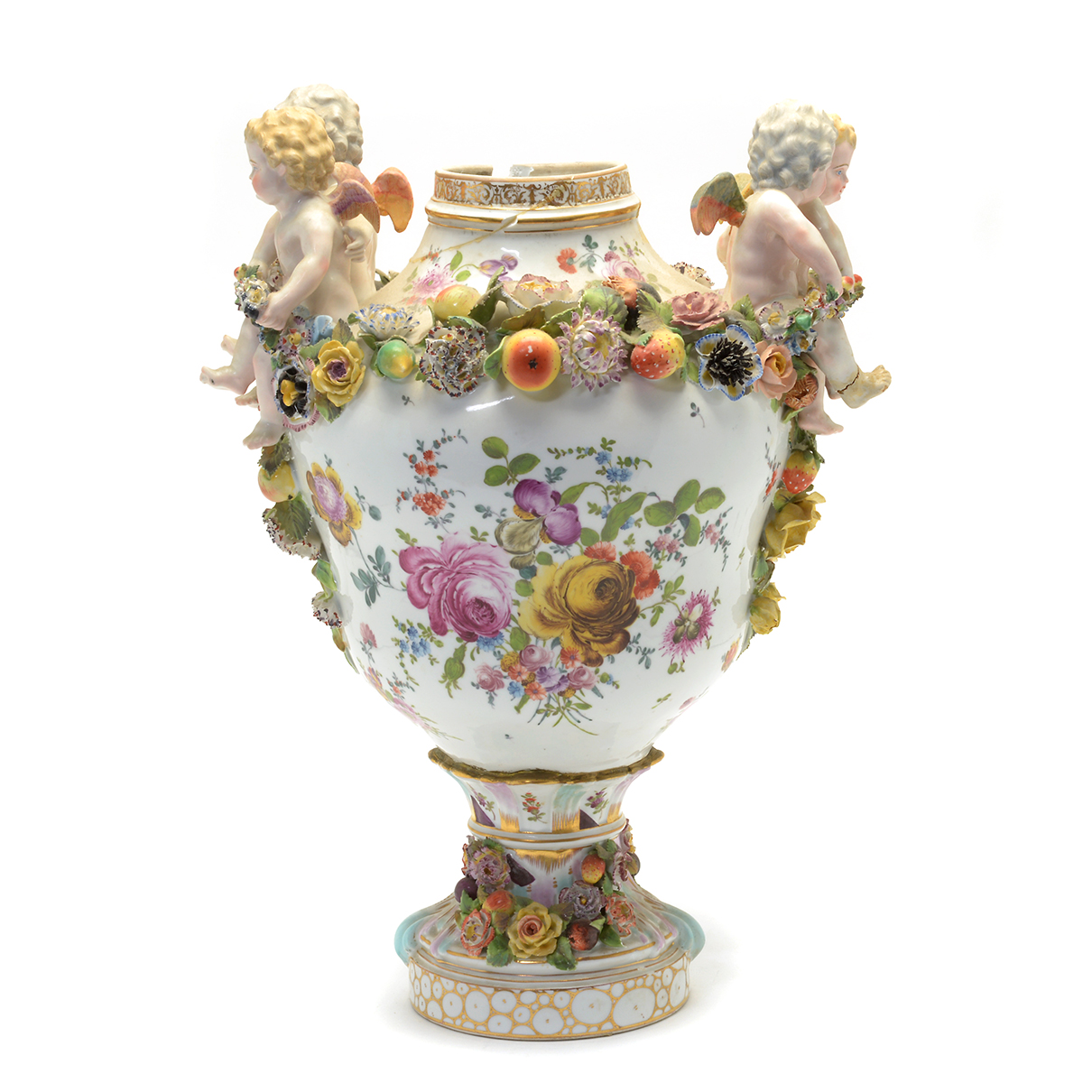 Condition: Repair to the mouth, with loss. Minor loss to applied flowers and leaves. Repair to putti wings and feet.
