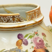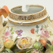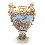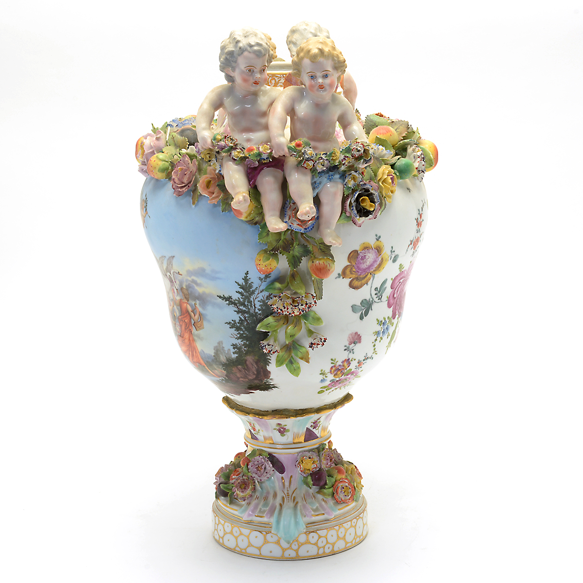 Four putti applied to the top, with a floral and fruit garland, toward the shoulder above a painted mythological scene to one side and a floral arrangement to the other.