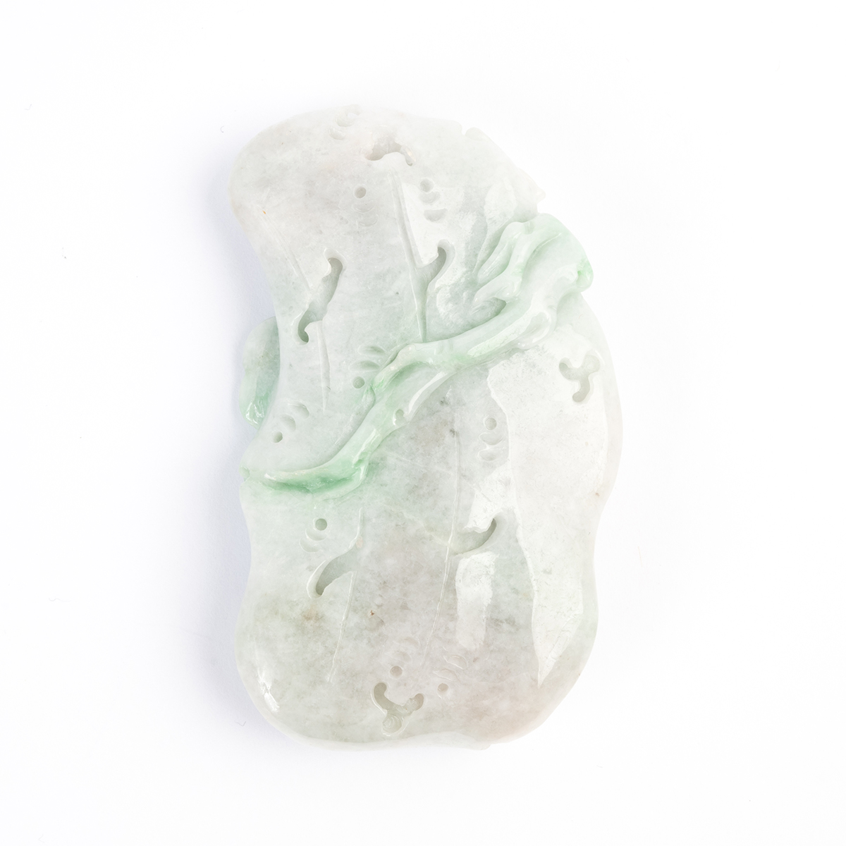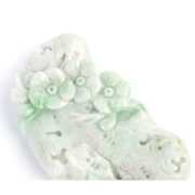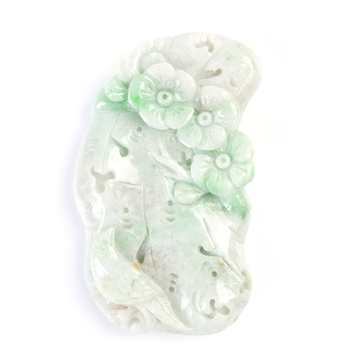 The carved and pierced jadeite jade pendant depicting birds with flowers and measuring approximately 69 x 41 x 14 mm.