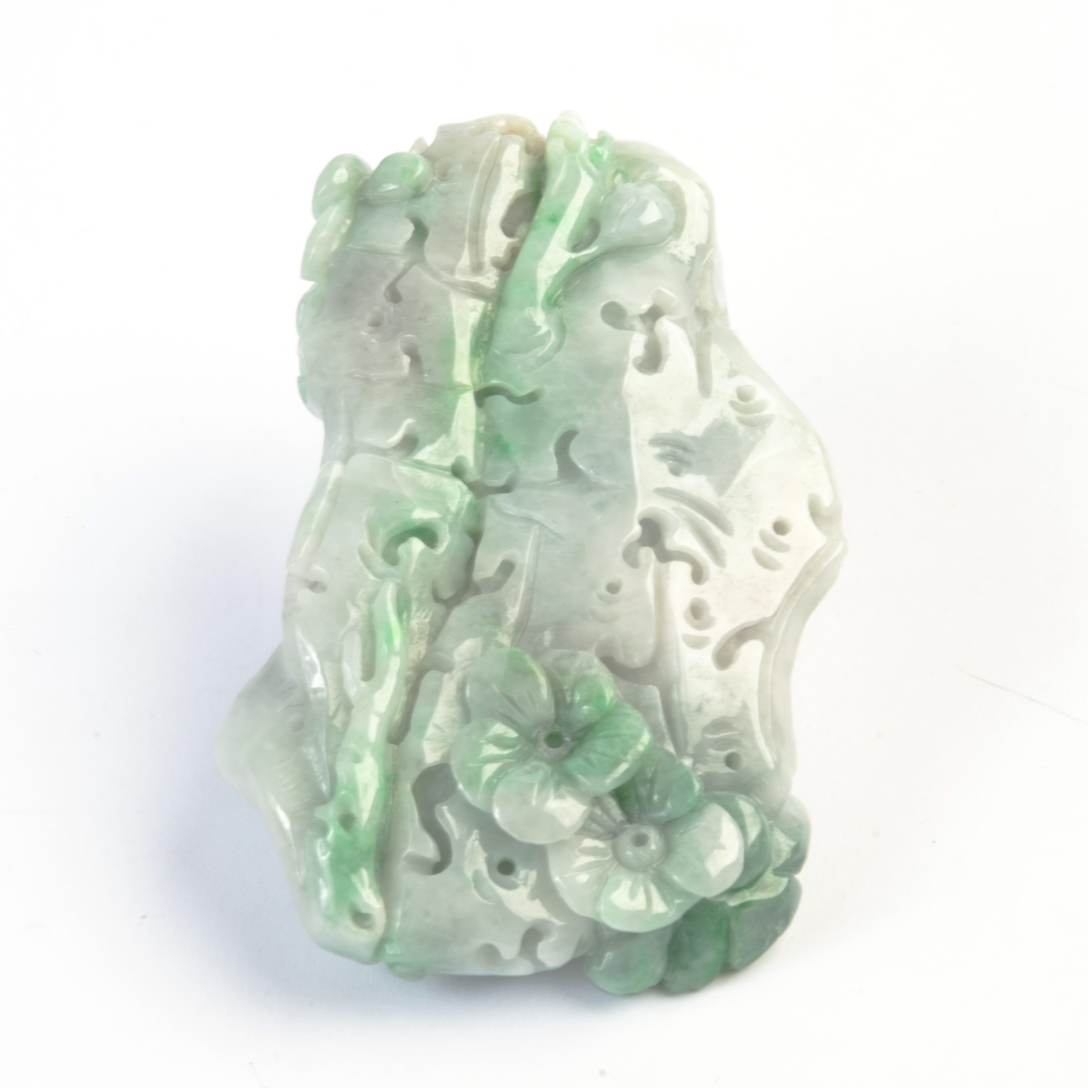 The carved jadeite jade pendant measuring approximately 69 x 42 mm and depicting birds in a tree with flowers.