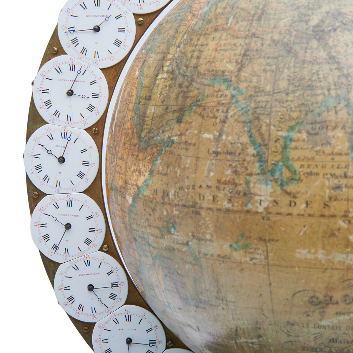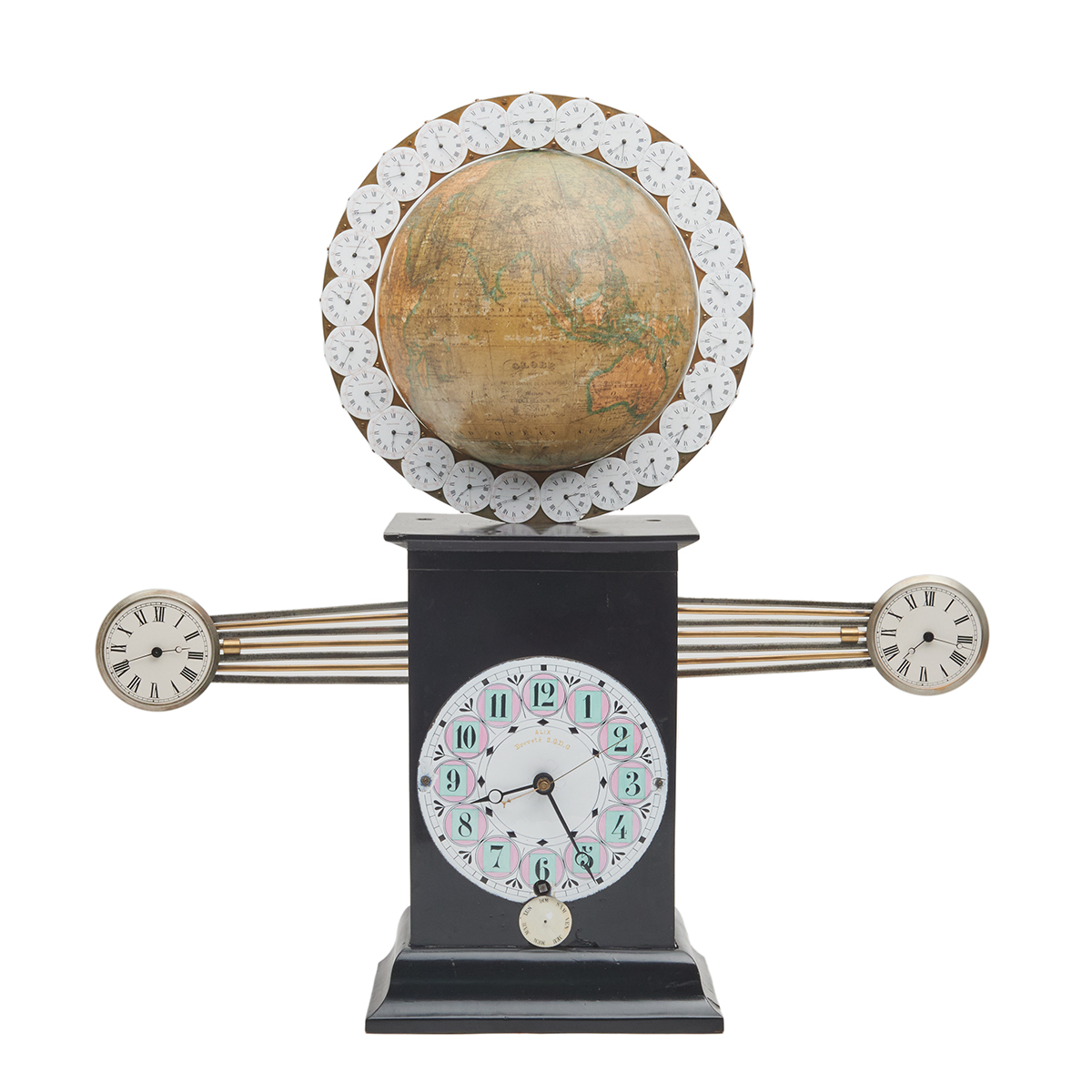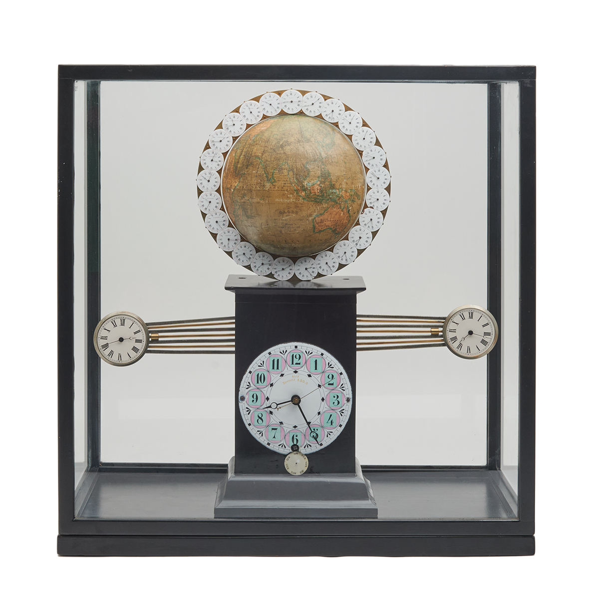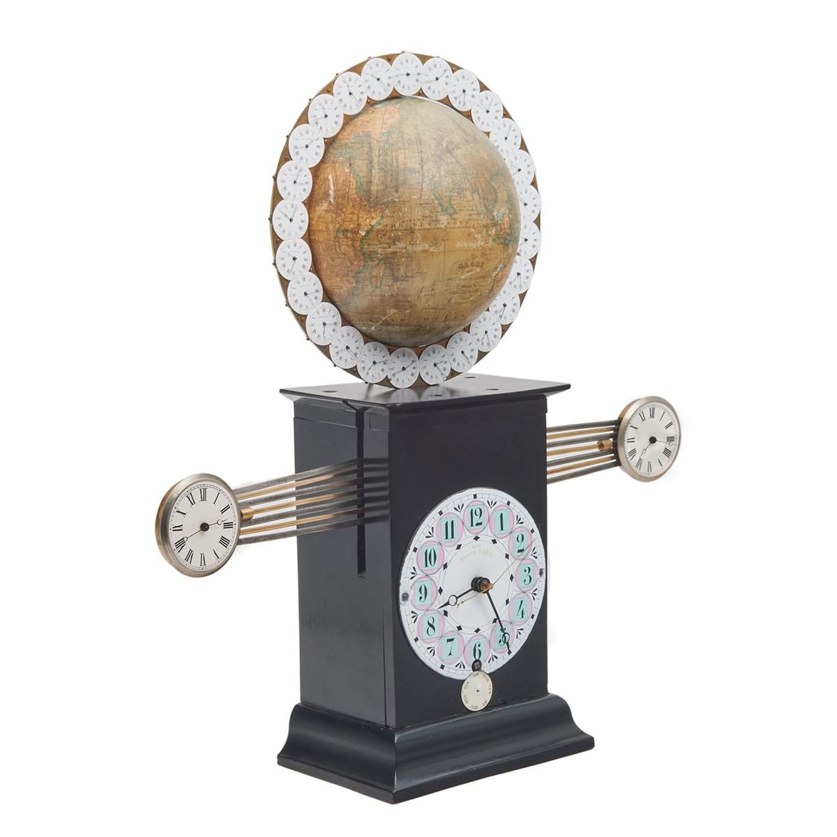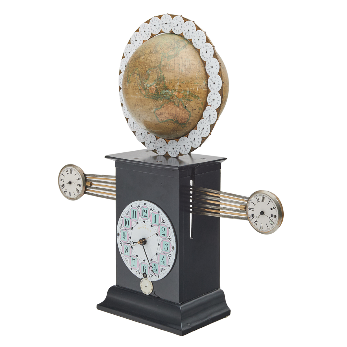 Globe to top framed with 25 miniature clock faces labeled with different regions ebonized body with see-saw like clock faces to either side, the main dial with enameled decoration and small day of the week dial below large ebonized case with glass panels.