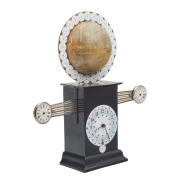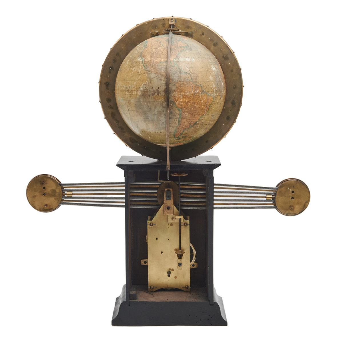 Condition: Has not been tested, working order is not guaranteed. Dials on arms look to be later. Wear to globe. Cracking and enamel loss to clock faces. Day of the week face lacking hand. Clock body with some apparent repairs and paint restoration, lacking back.