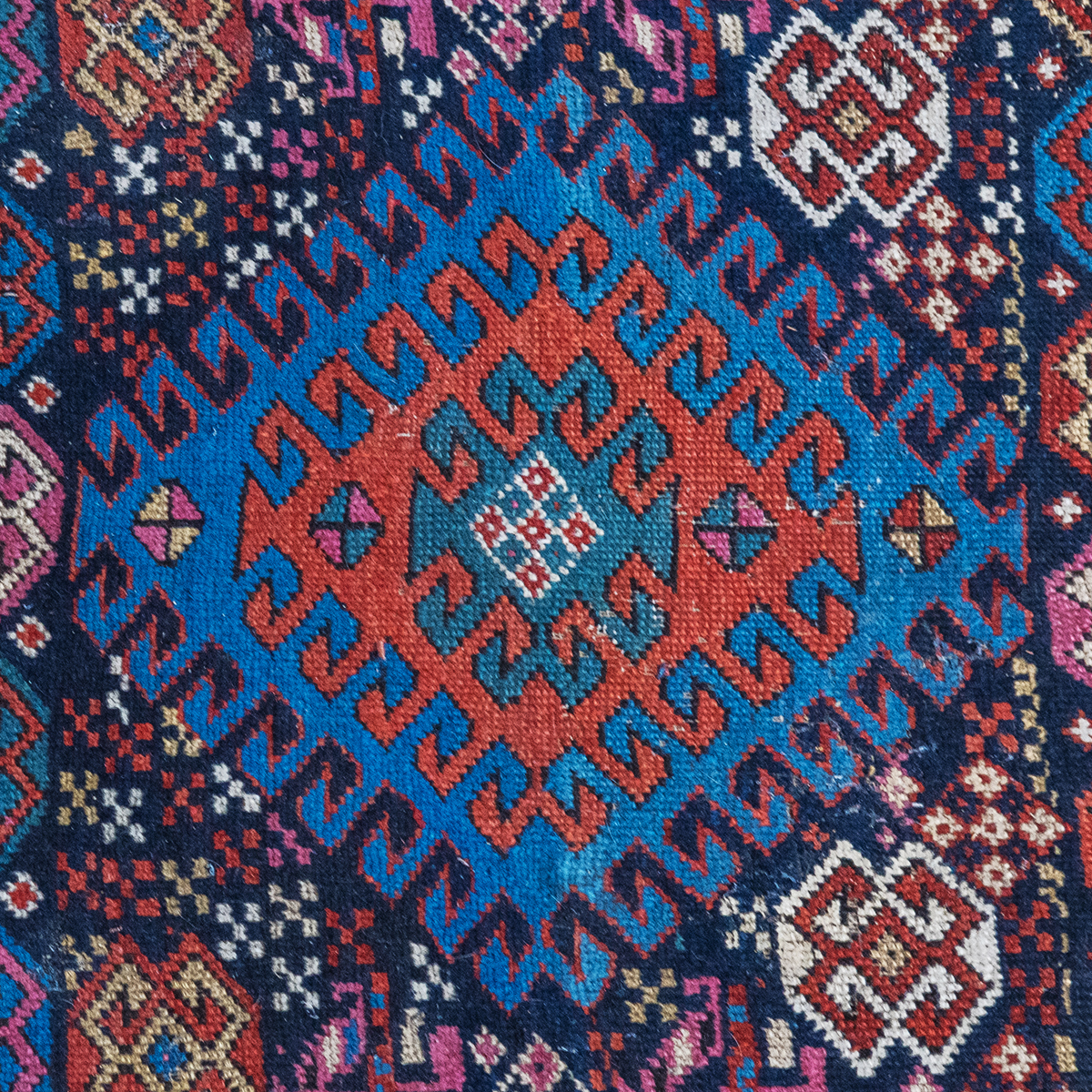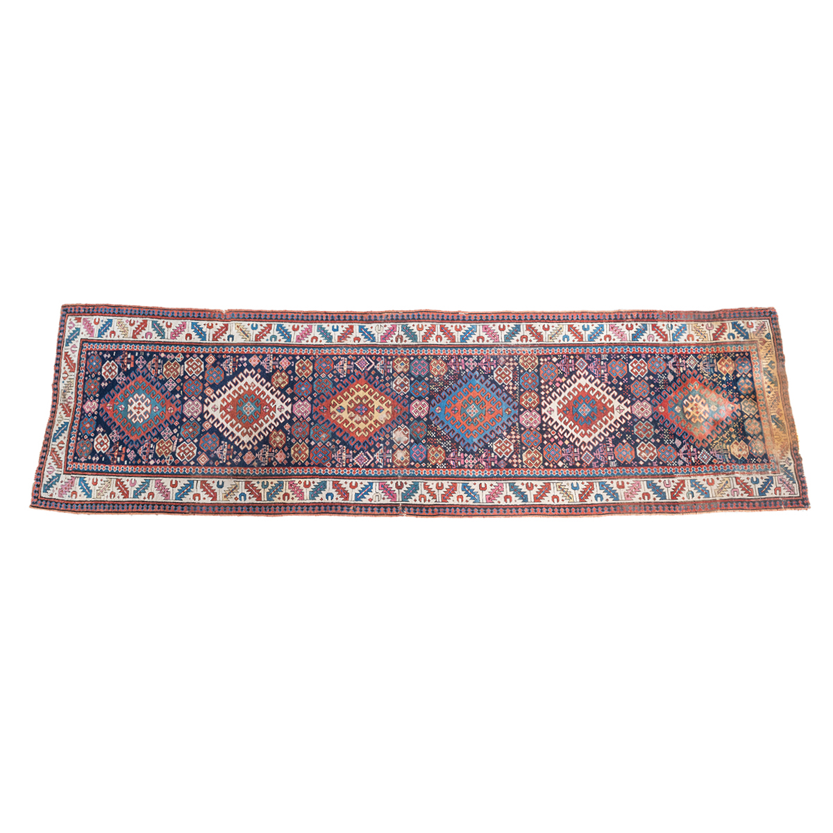 Condition: Some wear to pile with loss and apparent repair. Large stain to one end. Loss to fringe, fraying to edges.
