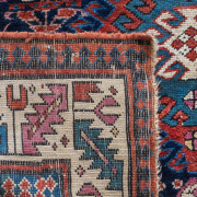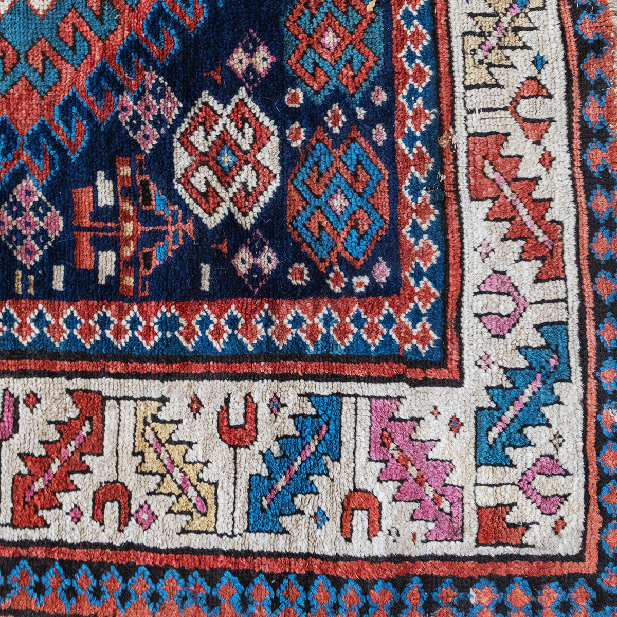 Six central medallions on dark blue ground, cream main border with single guards geometric motif throughout woven in reds, blues, cream, yellow, pink.