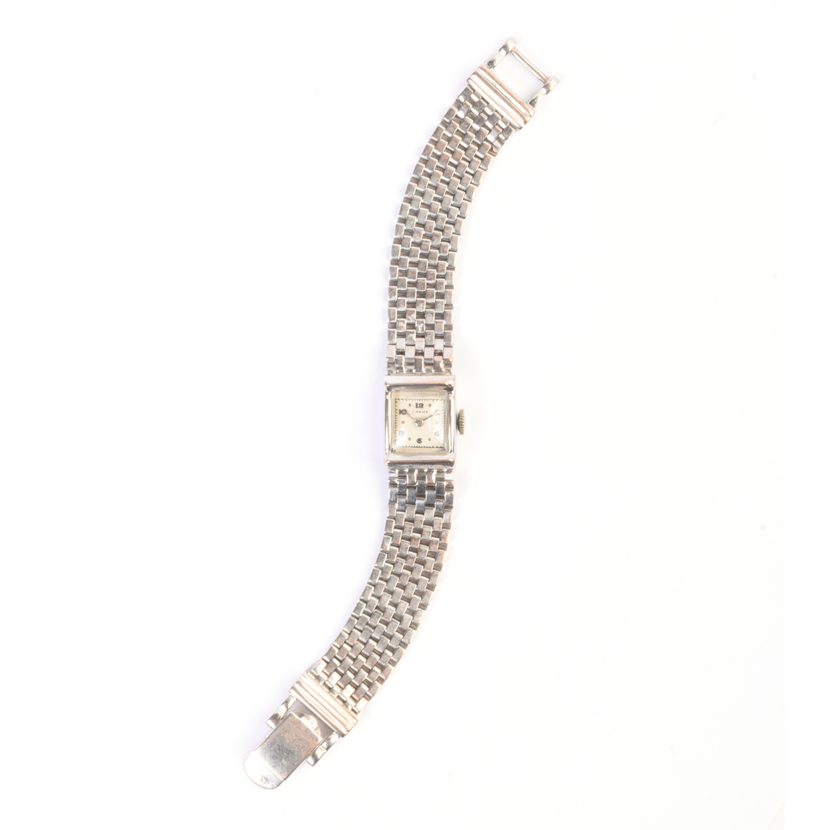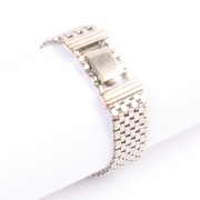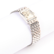 DIAL: Square, white, silver Arabic and dot hour markers, black outer minutes track, silver baton hands, Champ. MOVEMENT: Manual wind (not opened). CASE: Rectangle, 14k white gold, snapback (not opened), 18 x 14 mm. BRACELET: 14k white gold, mesh brick link, 13 mm in width, fold over clasp, 6 inches.