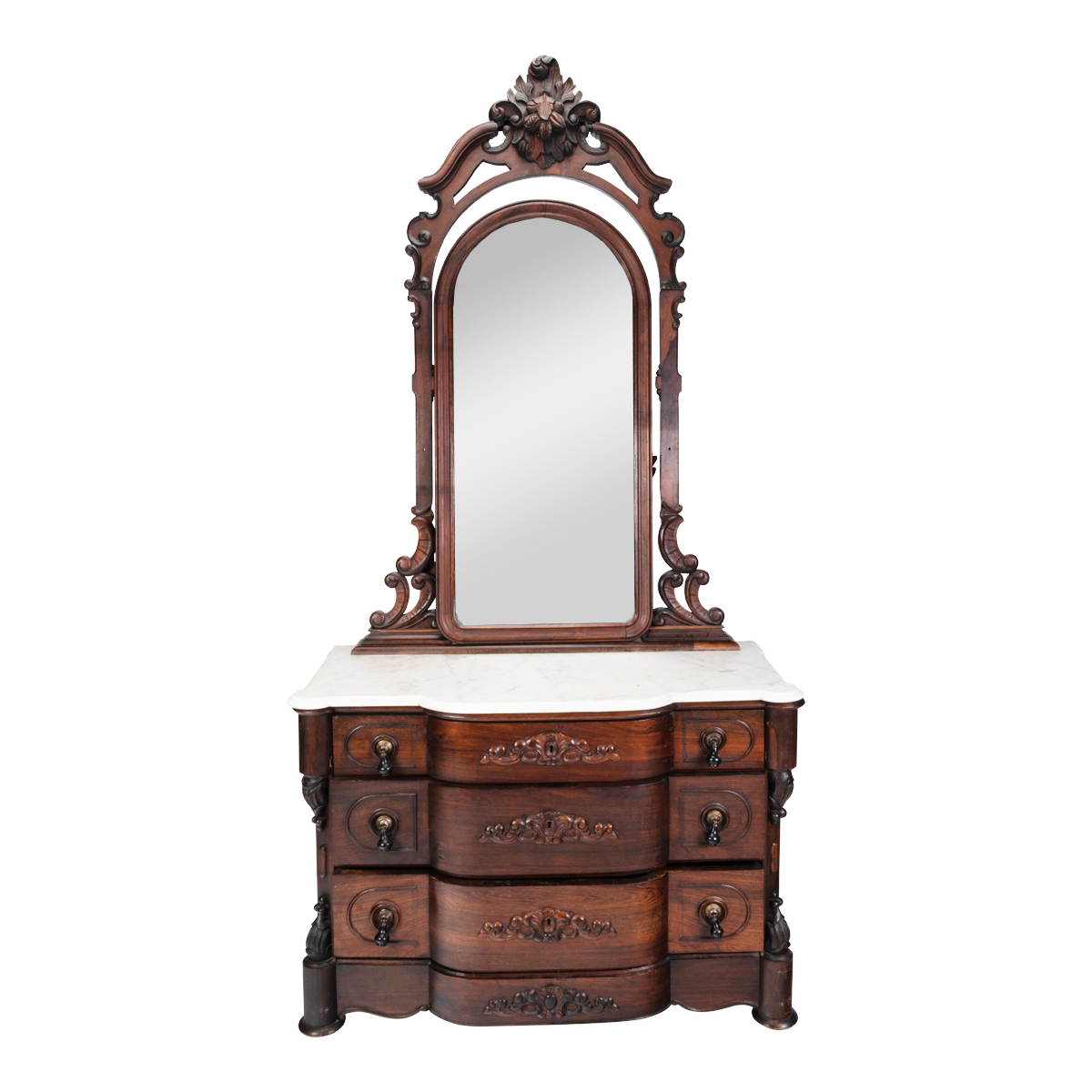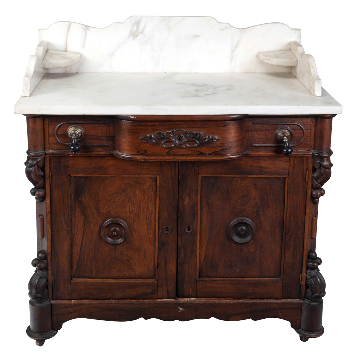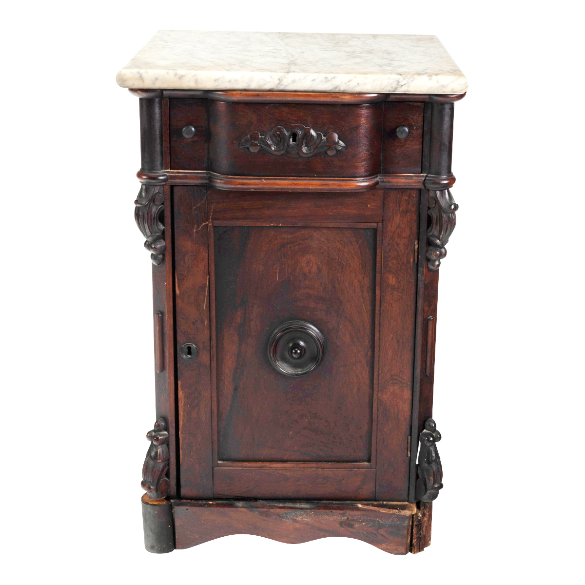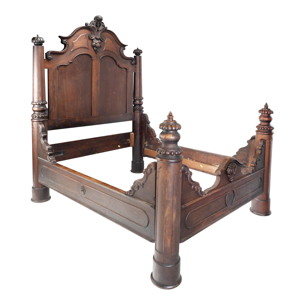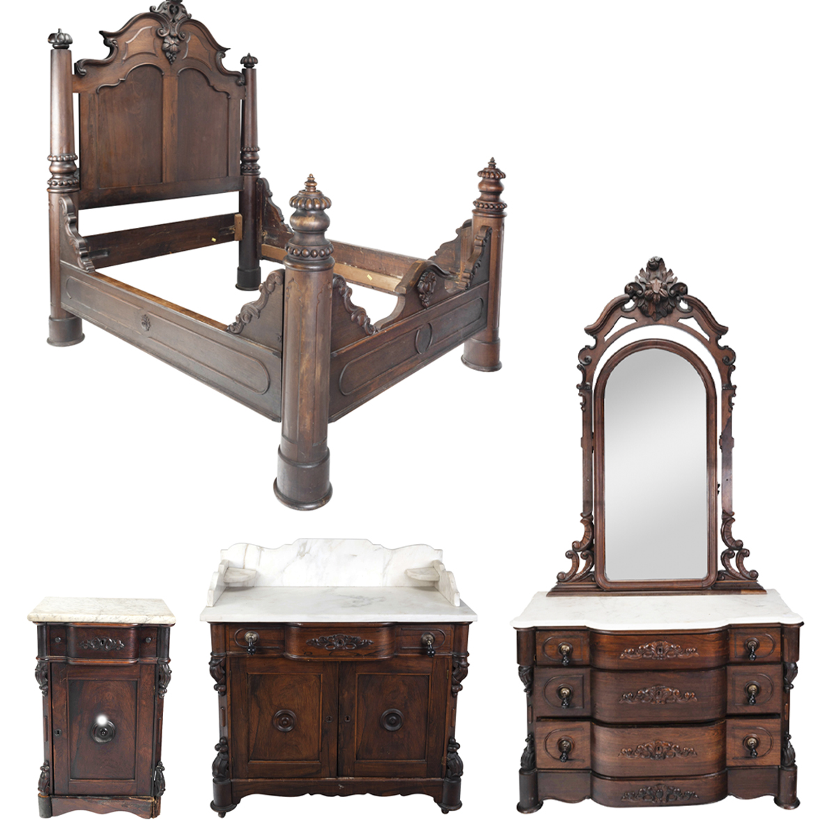 Condition: Some surface wear throughout includes veneer chips. Marble tops with some brown staining. Headboard crown with crack. Some loss to applied carvings with pieces available.