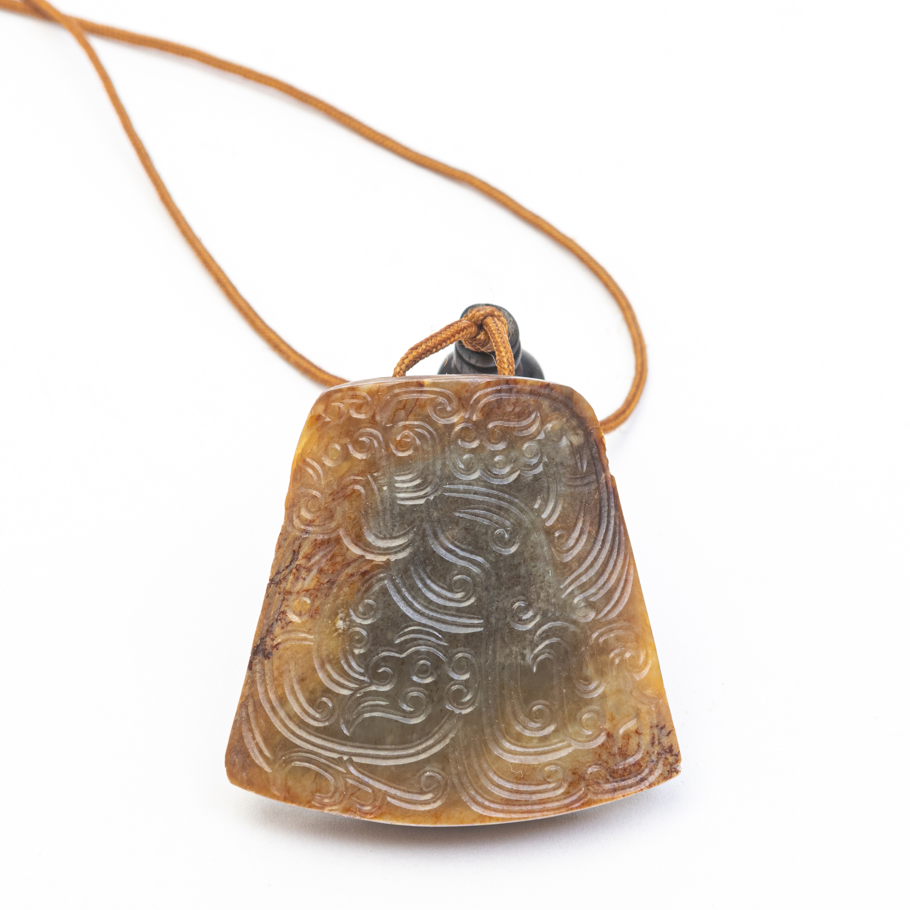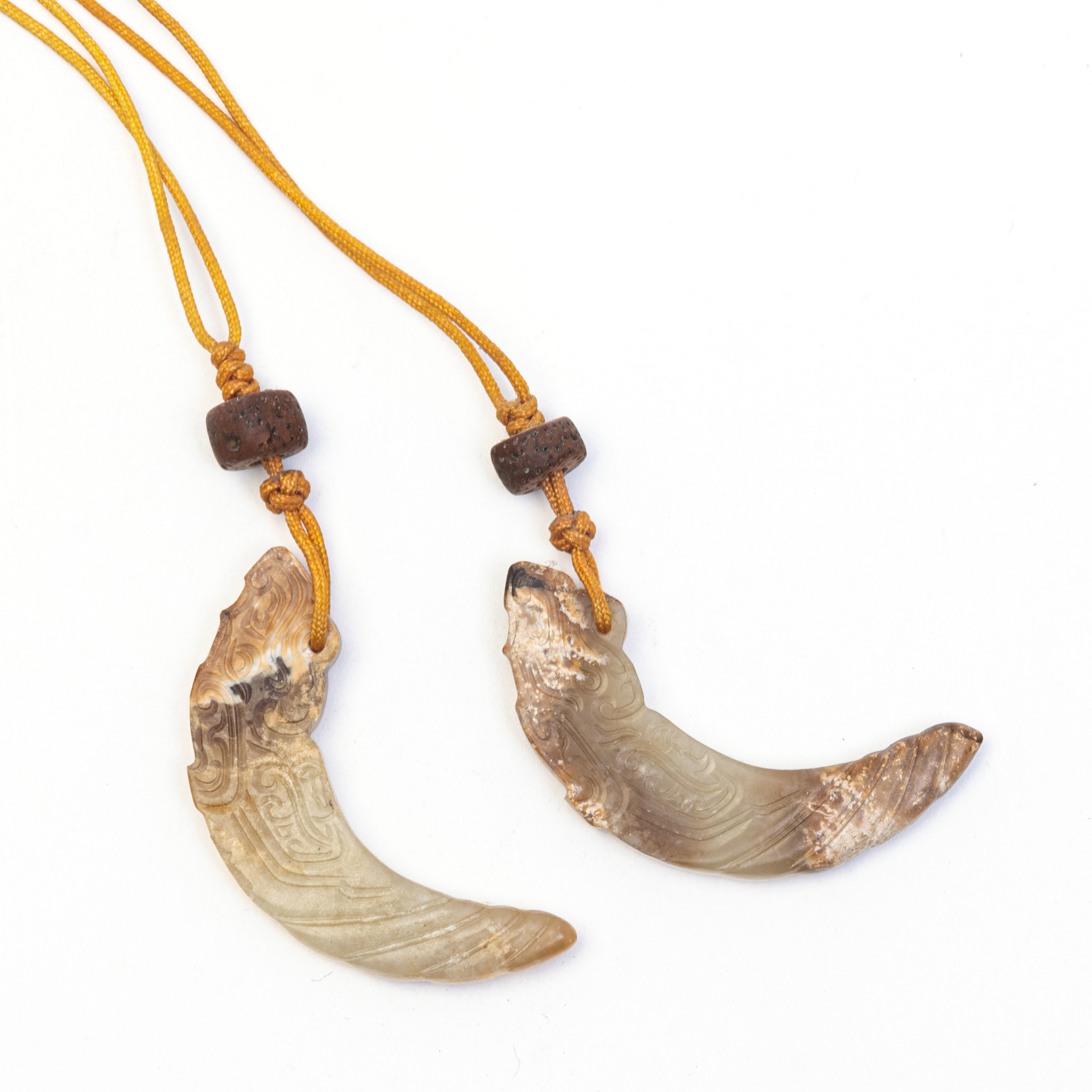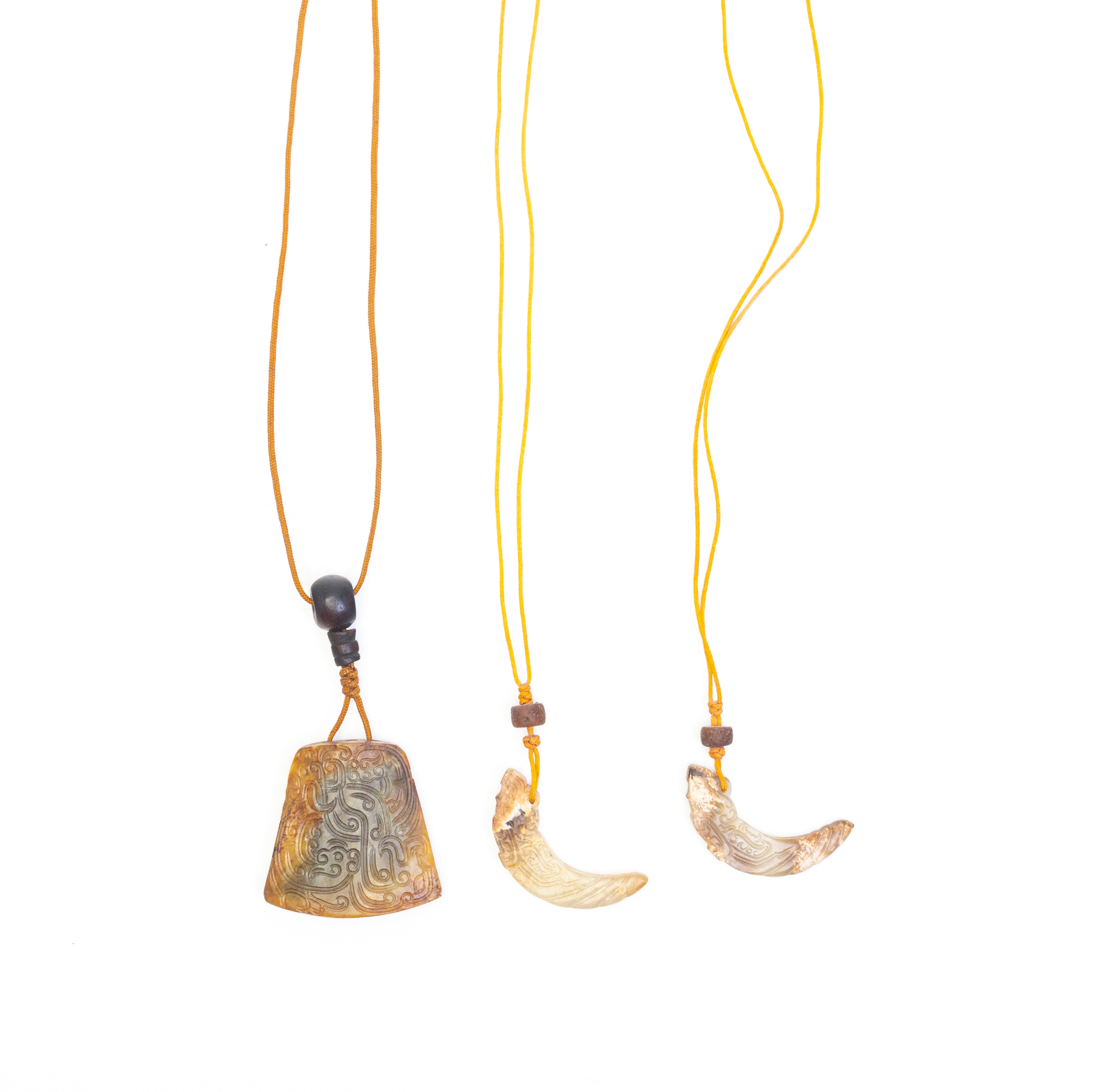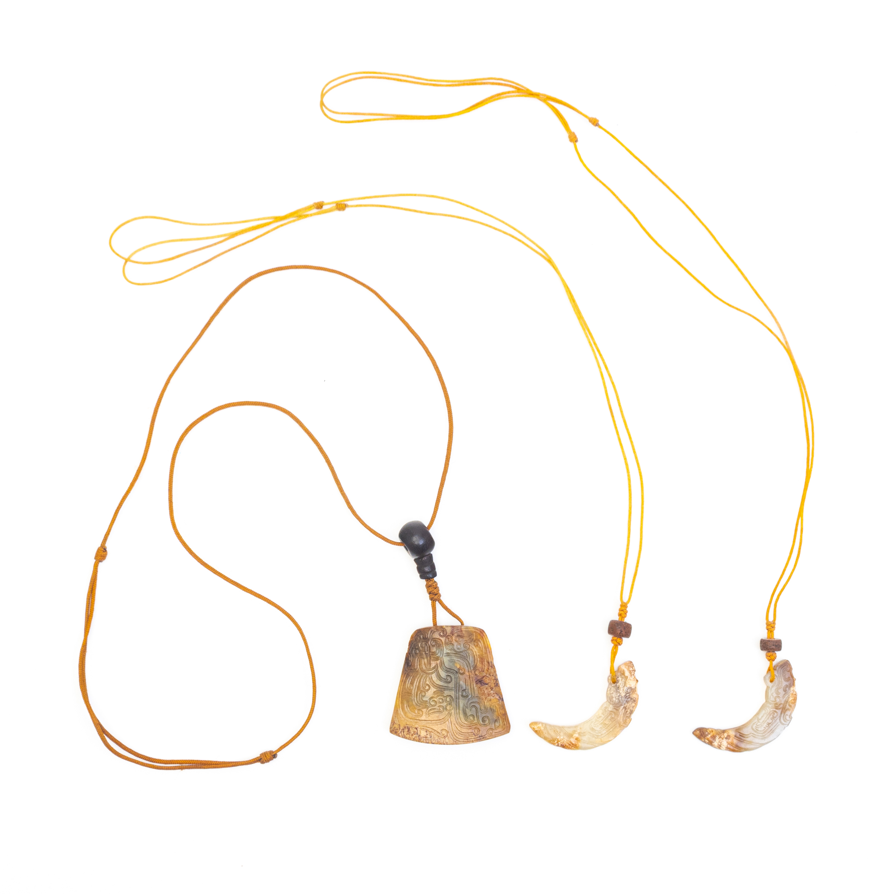 Comprising: the first is a pair of crescent-shaped dragon-headed pendants carved on both sides with stylized scrolls. The body tapers to a pointed end, and the celadon stone is stained brown in areas. They are attached to silk cords. The second is a trapezoidal-shaped ornament incised with a dragon and phoenix motif. The celadon stone is stained brown in areas, and it is attached to a silk cord.