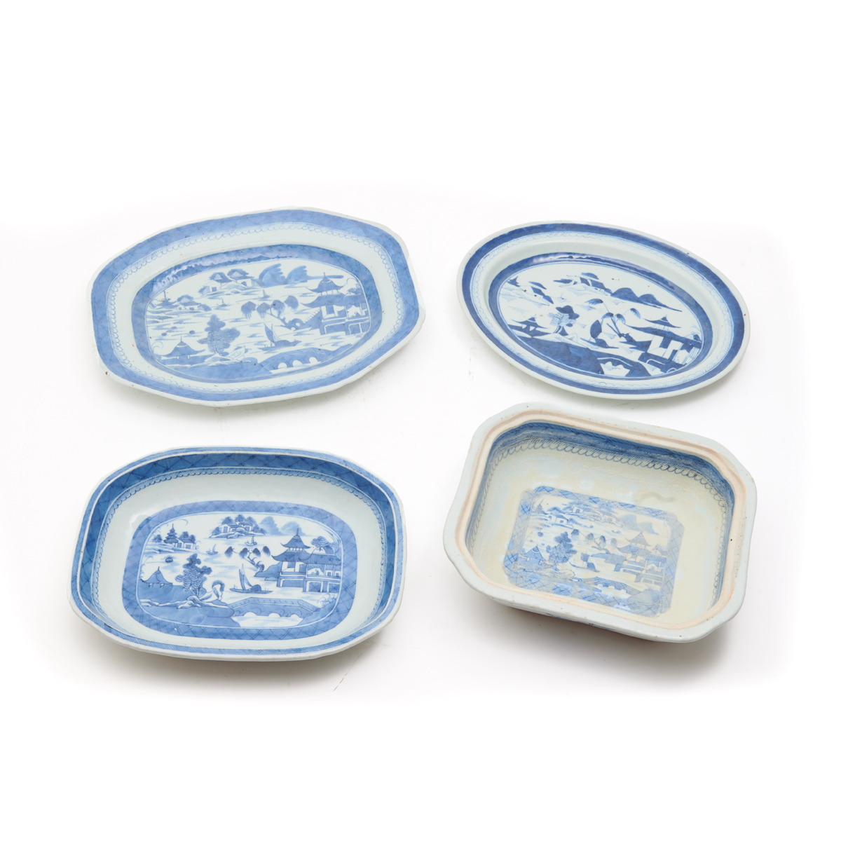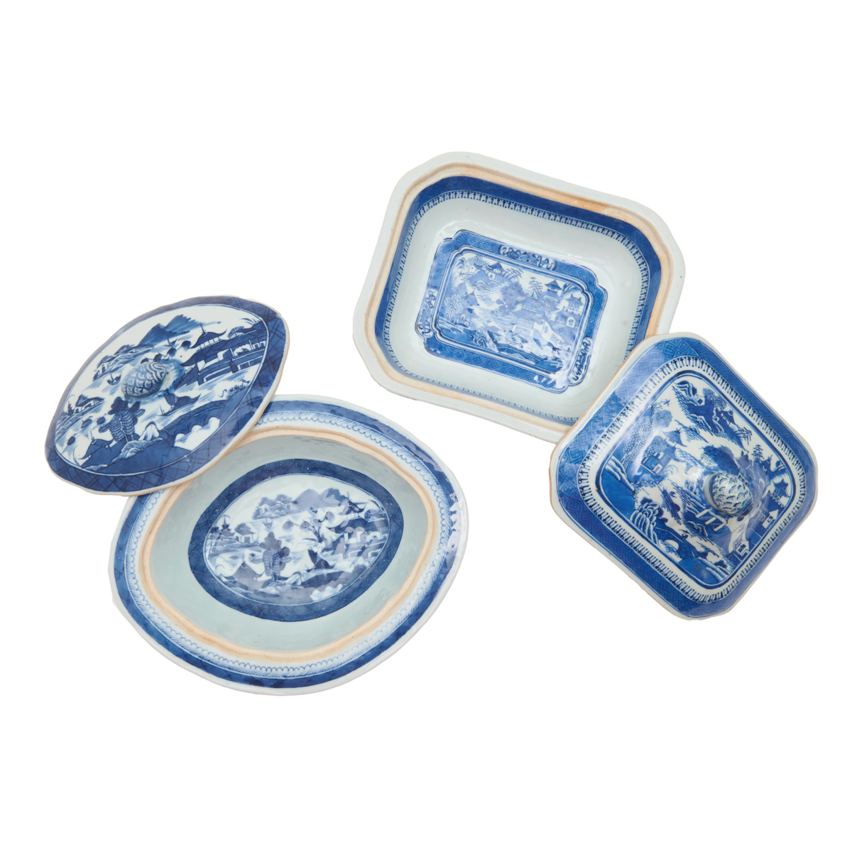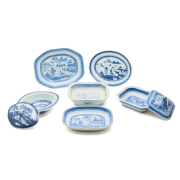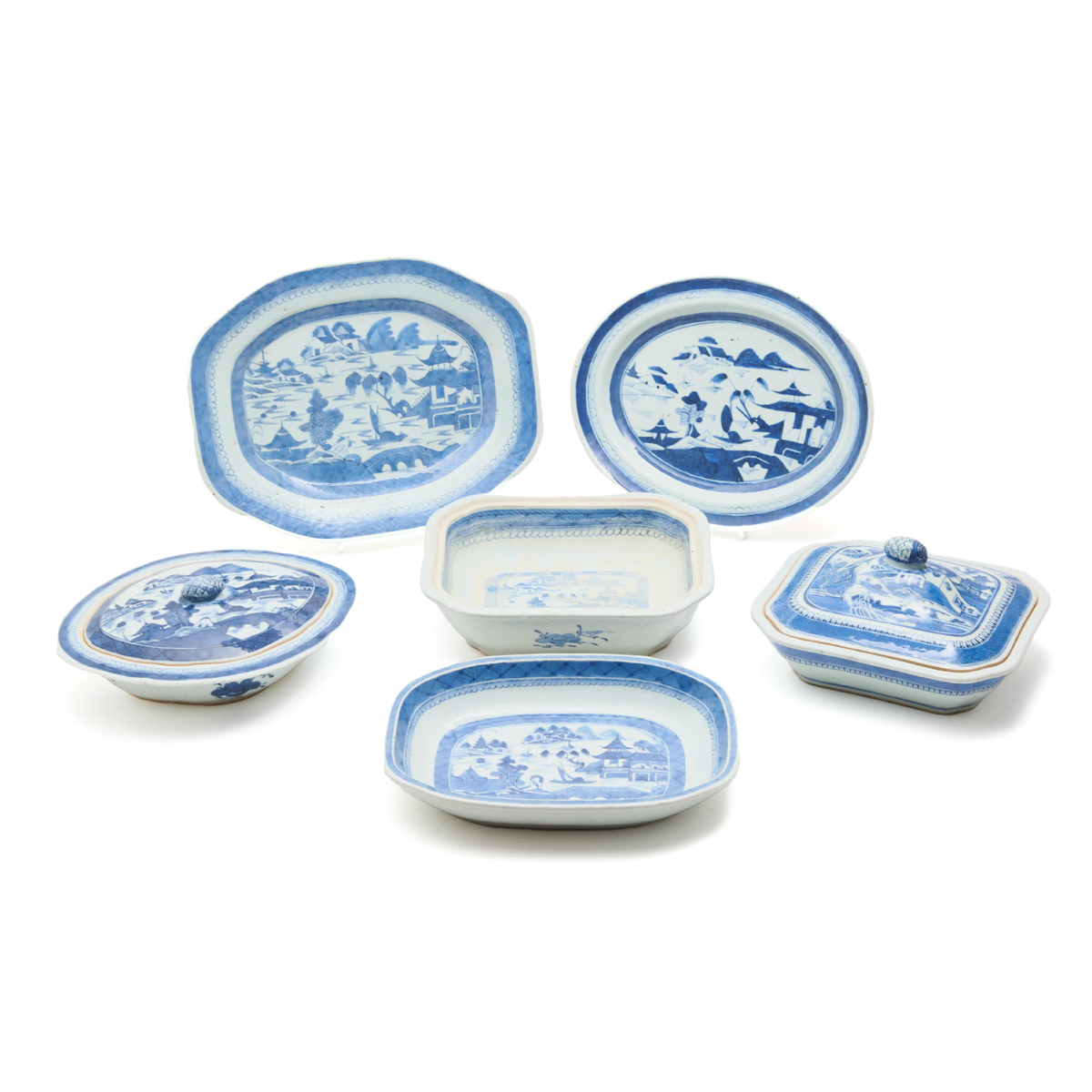 Including a shaped rectangular covered vegetable tureen, another lacking cover, an ovoidal covered vegetable tureen, a low open serving dish, an oval platter and octagonal platter. All painted with various watery landscapes, pavilions, islands, boats, man on bridge, etc. between bands of cell and diaper, spearhead and ovulos.