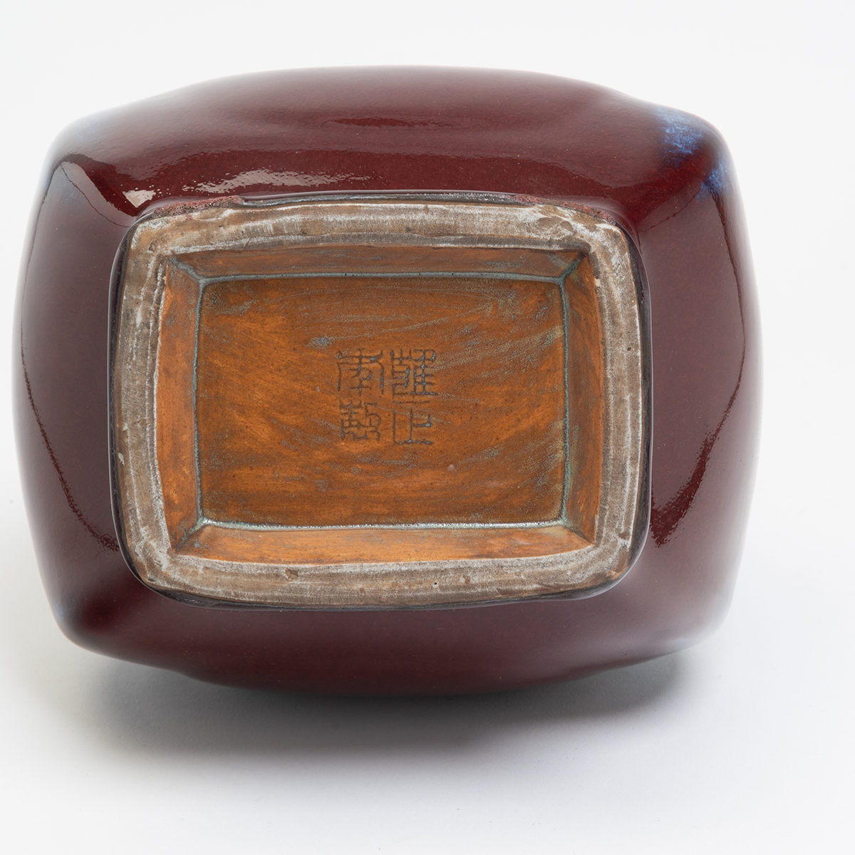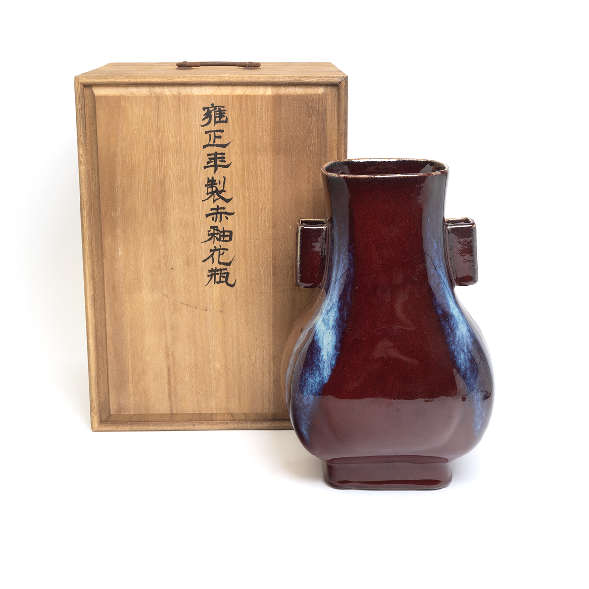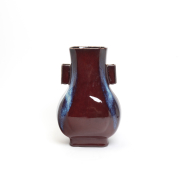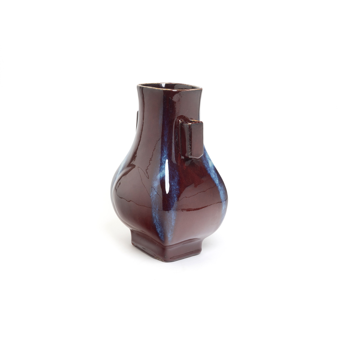 The square-section pear-shaped vase features squared tubular handles and is raised on a straight foot. The exterior is covered in a thick dark red glaze with purple and lavender tones.