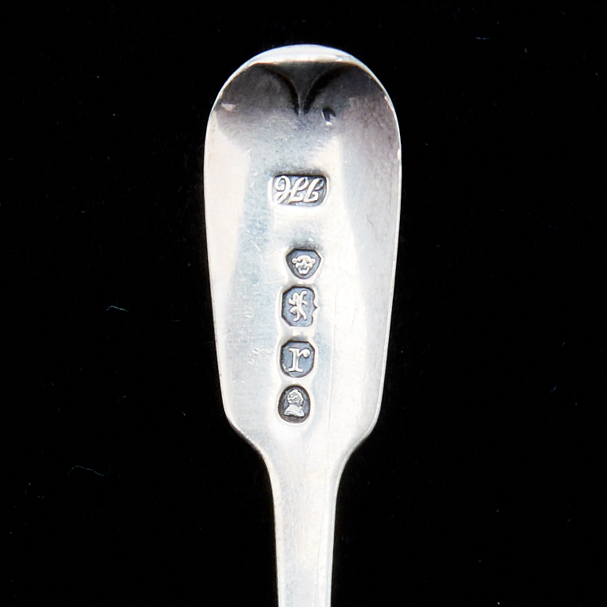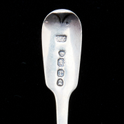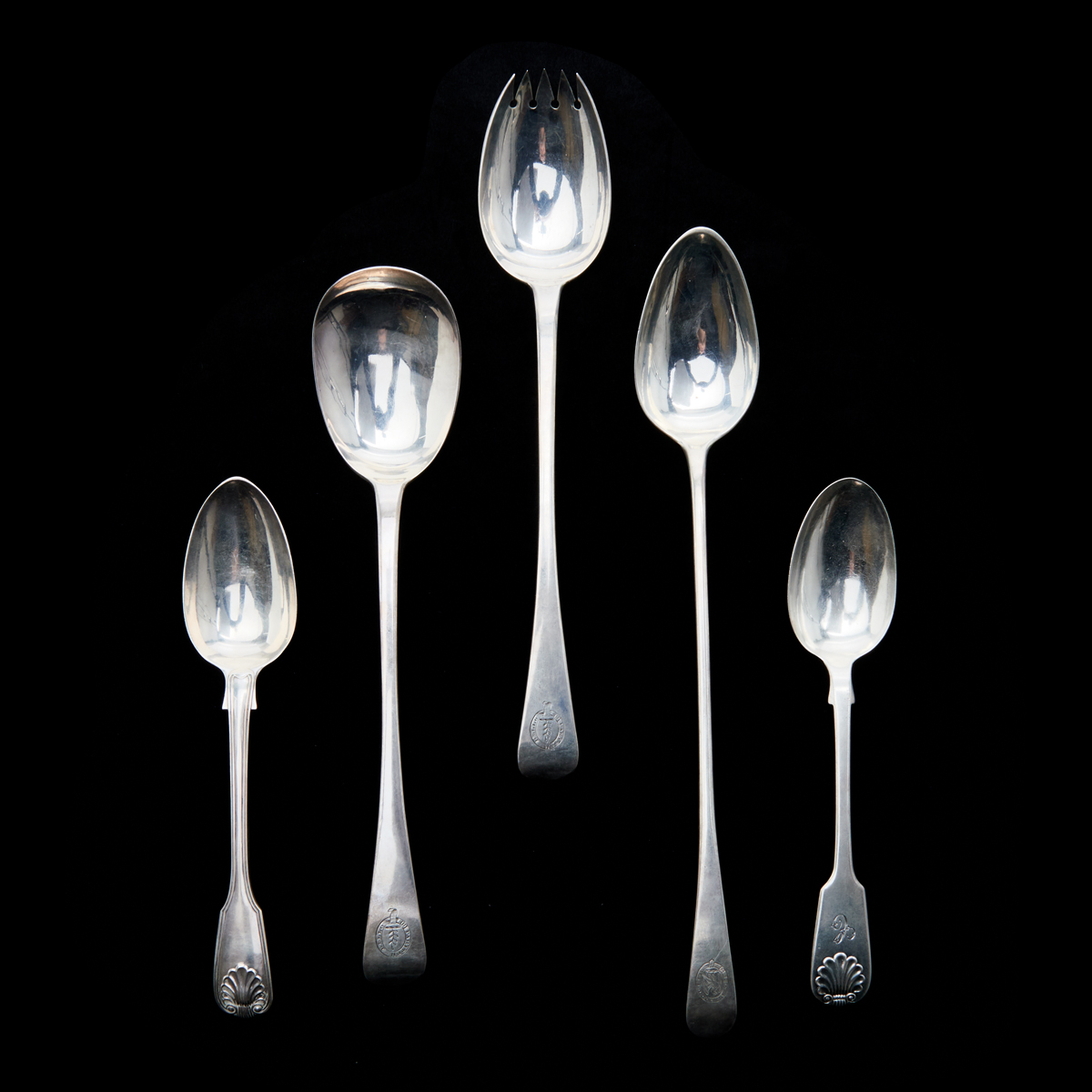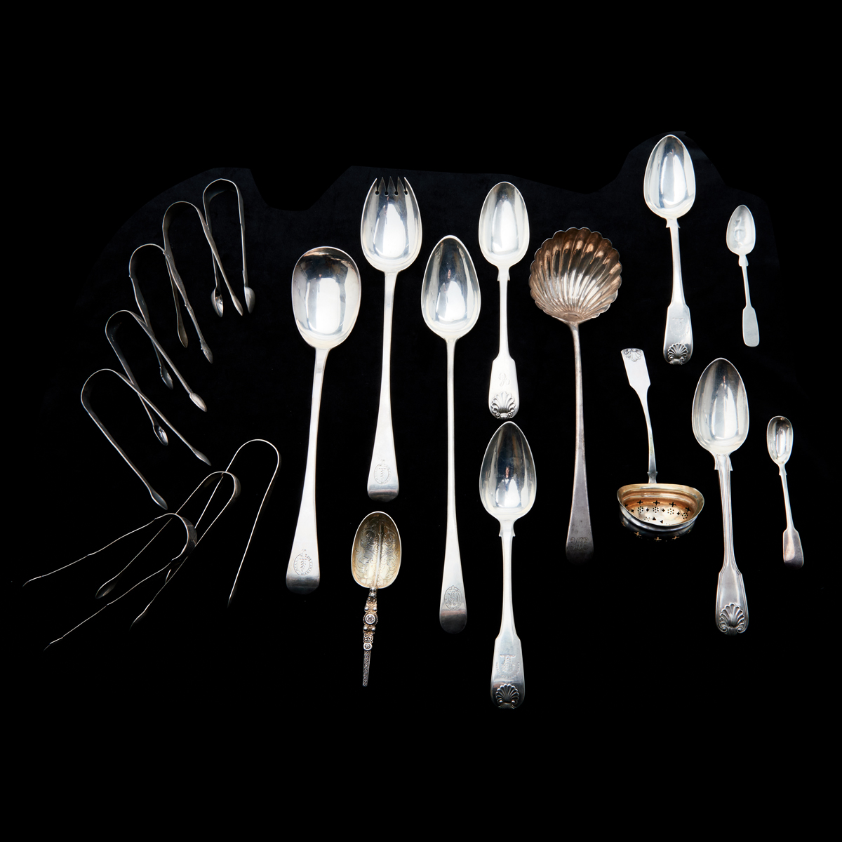Comprising Edinburgh 1791 Alexander Gardner serving spoon with eagle crest reading IN SUBLIME, pair of Edinburgh 1814 tablespoons with wheat bushel crests reading OTIUM CUM DIGNITAE, Edinburgh 1838 William Marshall tablespoon with C monogram, London 1814 William EleyII William Fearn salad serving spoon and fork with sprout crests reading PARITUR BELLO, London 1853 FH tablespoon, London 1902 Goldsmiths Silversmiths Co Ltd unusual engraved short handle decorative spoon, London 1832 Jonathan Hayne olive spoon, London 1821 Robert Rutland tongs, London 1802 Peter Ann William Bateman engraved tongs, London 1793 Peter Ann Bateman engraved tongs, London 1791 Peter Ann Bateman tongs, London 1806 Peter William Bateman engraved tongs, London 1793 IB tongs, London 1810 Peter William Bateman tongs, London 1797 Peter Ann Bateman engraved tongs also with shell ladle with rubbed marks, Danish pierced ladle with gilt wash and monogram, and F. SCHMIDT teaspoon possibly coin silver.
