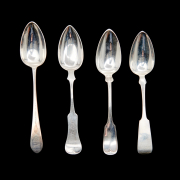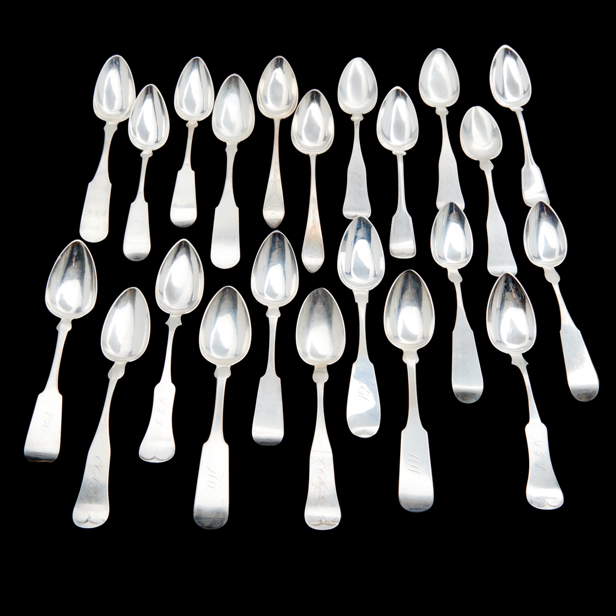 Tablespoons, most with monograms, 22 pieces total names include Horton, Lord Co, Bailey, Kinsey, Randall, Pangborn Brinsmaid, Crittenden, etc. also with two English sterling tablespoons.