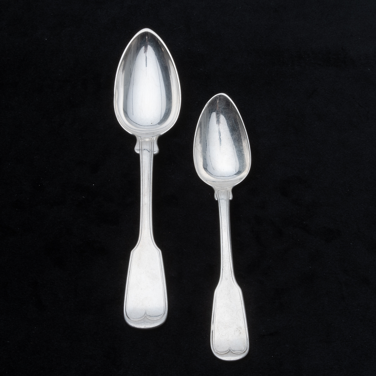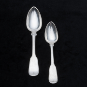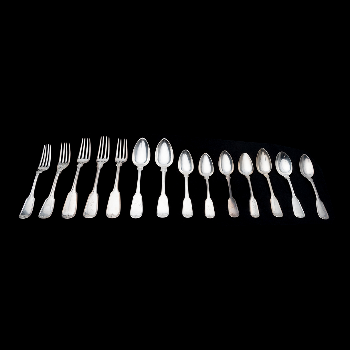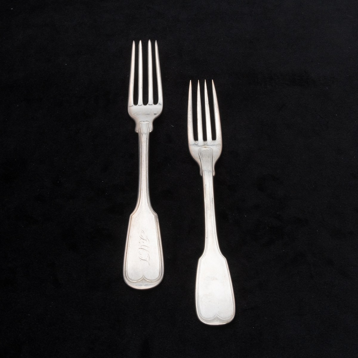 Comprising 4 Frank Smith sterling teaspoons, 7 W. Gale sterling spoons, 6 Bennet Caldwell coin silver spoons, 4 H. Hotchkiss coin silver spoons, 2 W. Brown coin silver spoons, 2 JD Chase coin silver spoons, 4 GK Childs coin silver forks, 4 AH Hayden coin silver forks, 2 Stebbins coin silver spoons, 4 additional pieces with rubbed marks some monograms throughout. (39 pieces total).