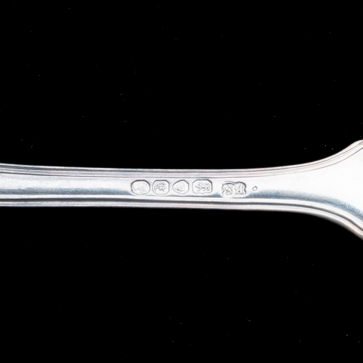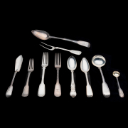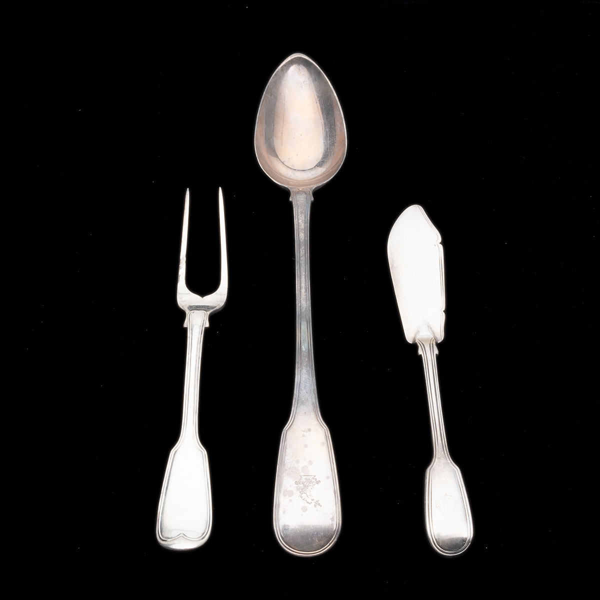 Various makers comprising 5 1833 London spoons, 12 BG place spoons with 2 forks and teaspoon, 6 Benjamin Smith III 1840 place forks, 5 William Chawner place forks with 2 ladles and meat fork, 1 1808 Eley Fearn Chawner serving spoon with 1 meat fork 23 additional spoons, forks, and fish knife with hallmarks some with monograms or crests (58 pieces total).