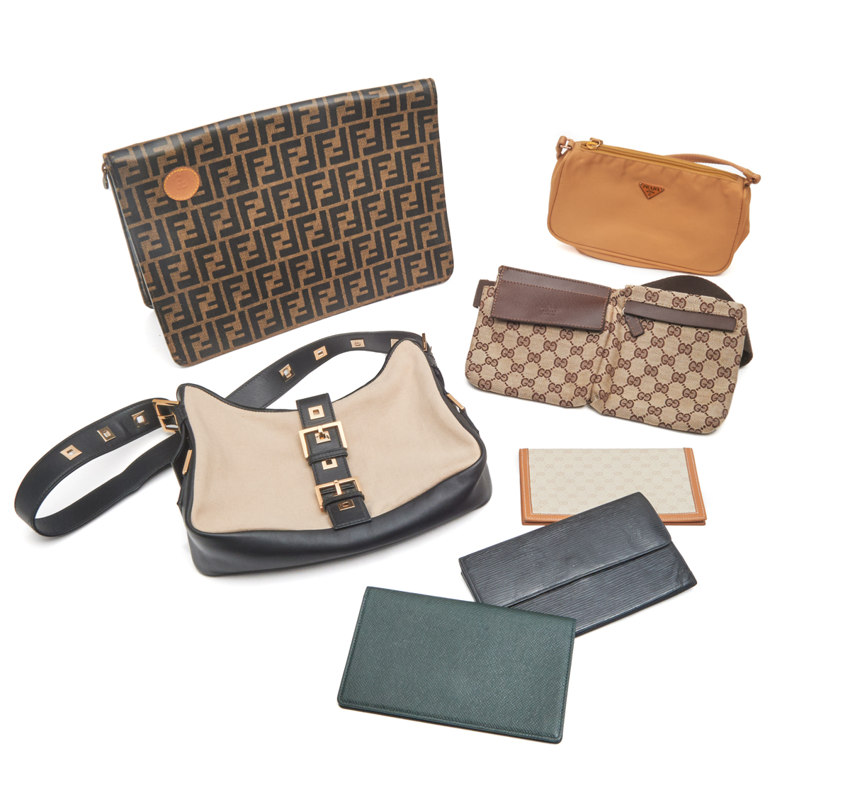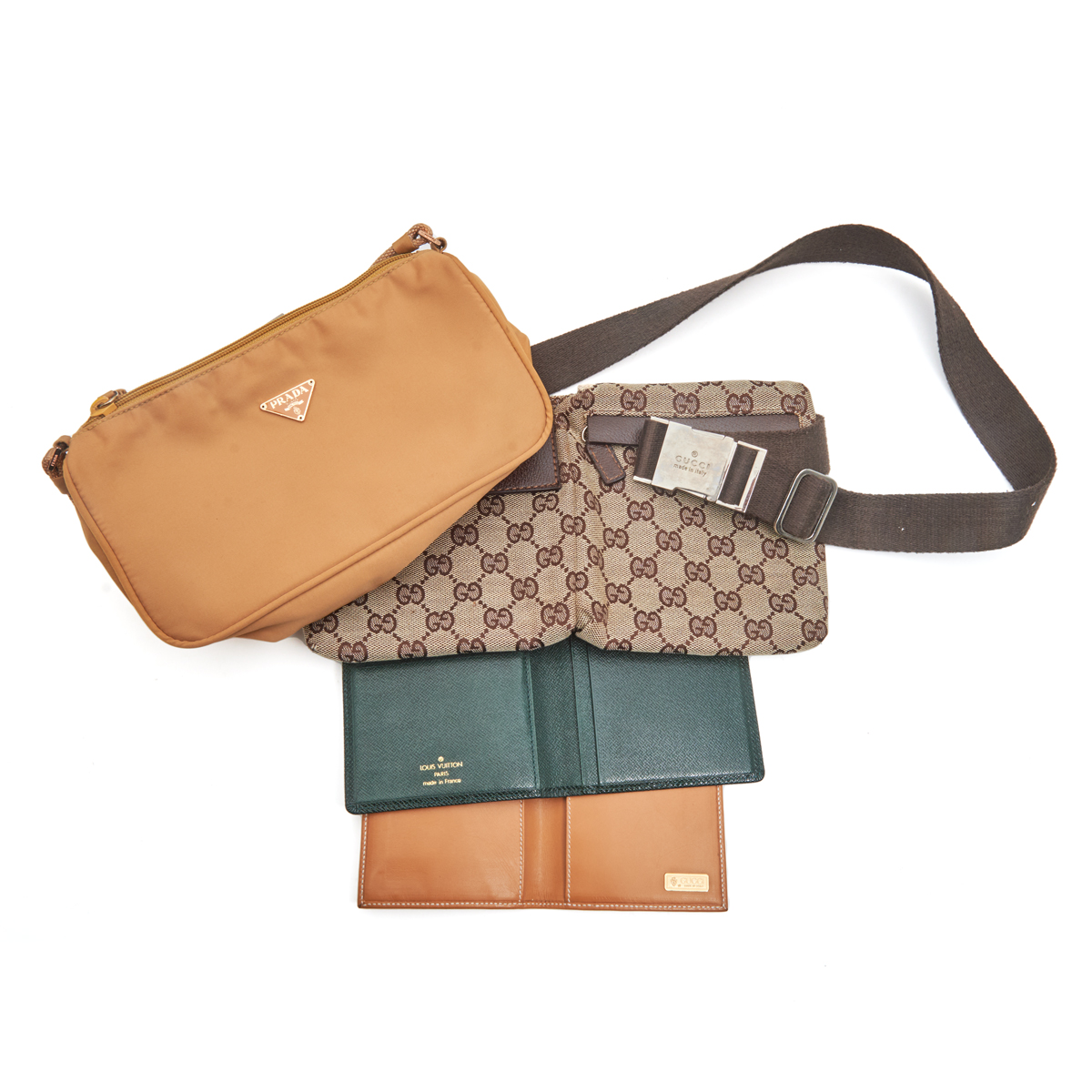 Comprising Fendi monogram leather folio, Yves Saint Laurent canvas and dark blue leather handbag, Prada toiletry bag, Gucci monogram canvas shoulder bag with leather trim, Gucci monogram leather wallet, Louis Vuitton dark green Taiga leather bifold wallet, Louis Vuitton black epi leather trifold wallet.