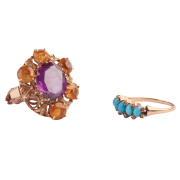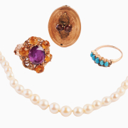 Including one cultured pearl, 14k yellow gold graduated 18 inch necklace one amethyst, citrine, 10k rose gold ring, size 6 3/4 one turquoise, 10k rose gold ring, size 7 1/4 together with one round-cut garnet, 9k rose gold oval brooch measuring approximately 23 x 31 mm.