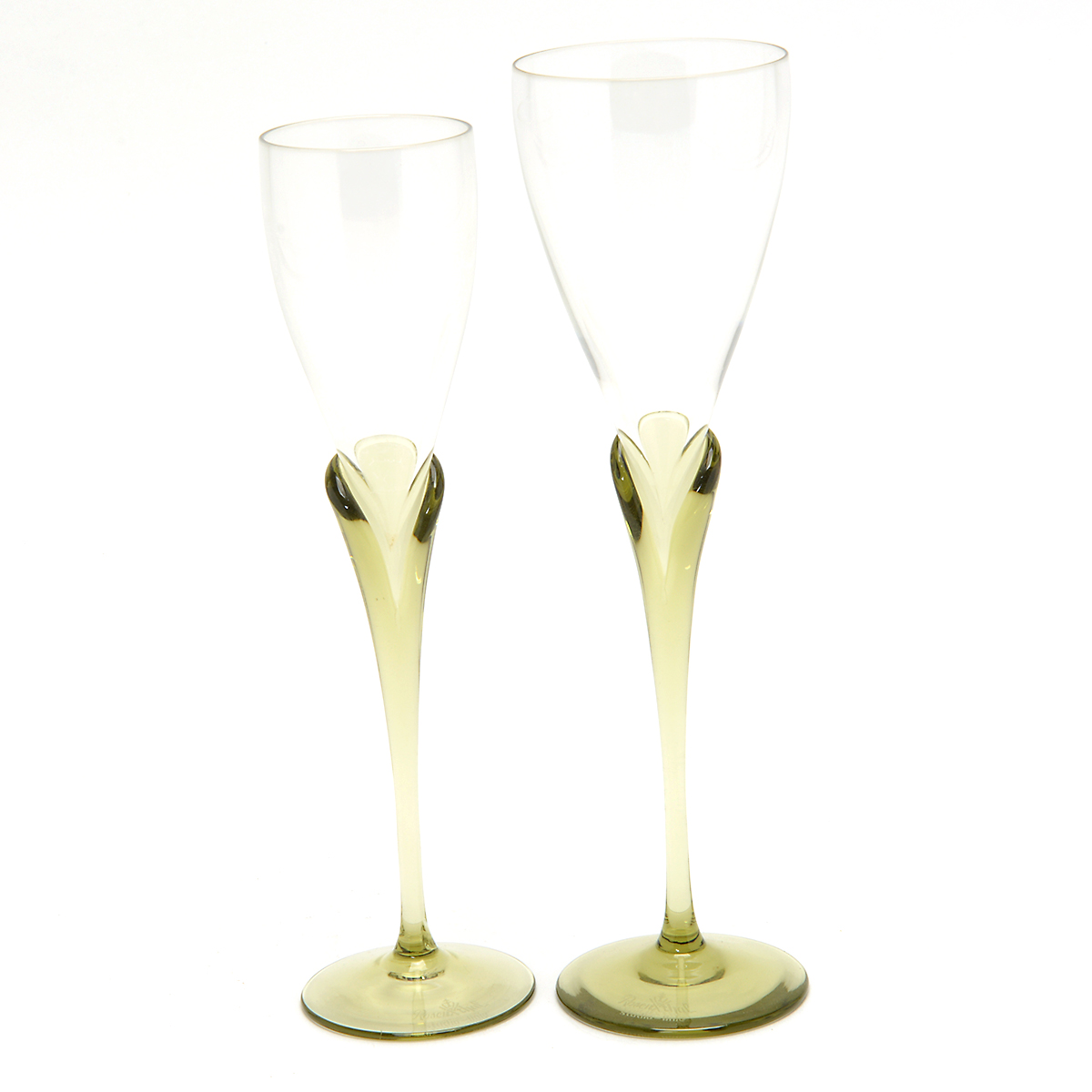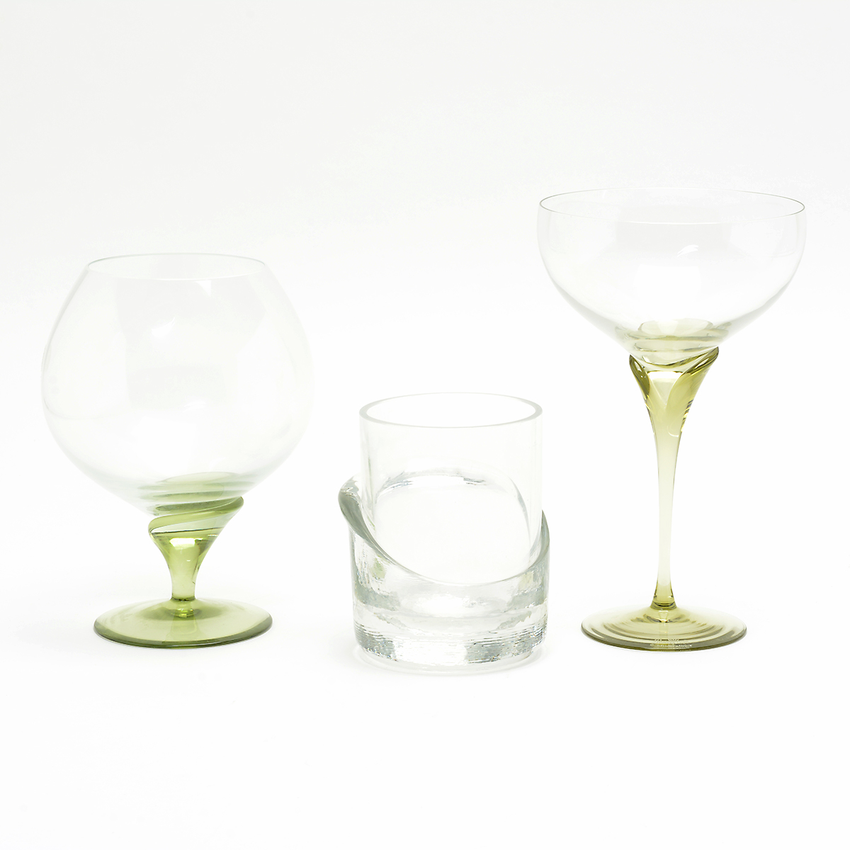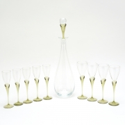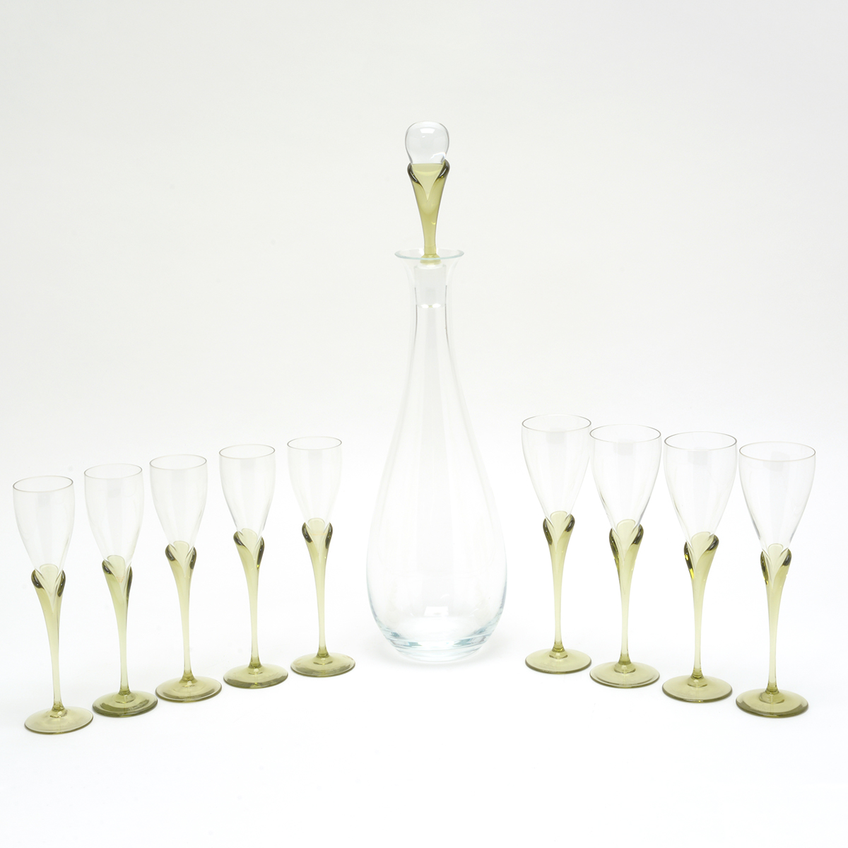 Green Calice set comprising a decanter, eight brandy glasses, twelve tall sherberts, six sherry glasses, and seven cordial glasses. With five unassociated studio-line textured tumblers.