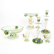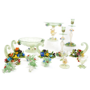 Green glass with gilt trim, floral and foliate encrusted comprising centerpiece bowl, compote with swan stem, pair of candlesticks, four decorative cornucopia pieces, 2 aperitif glasses, small cover with no match, four bottle stoppers.