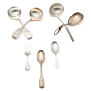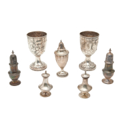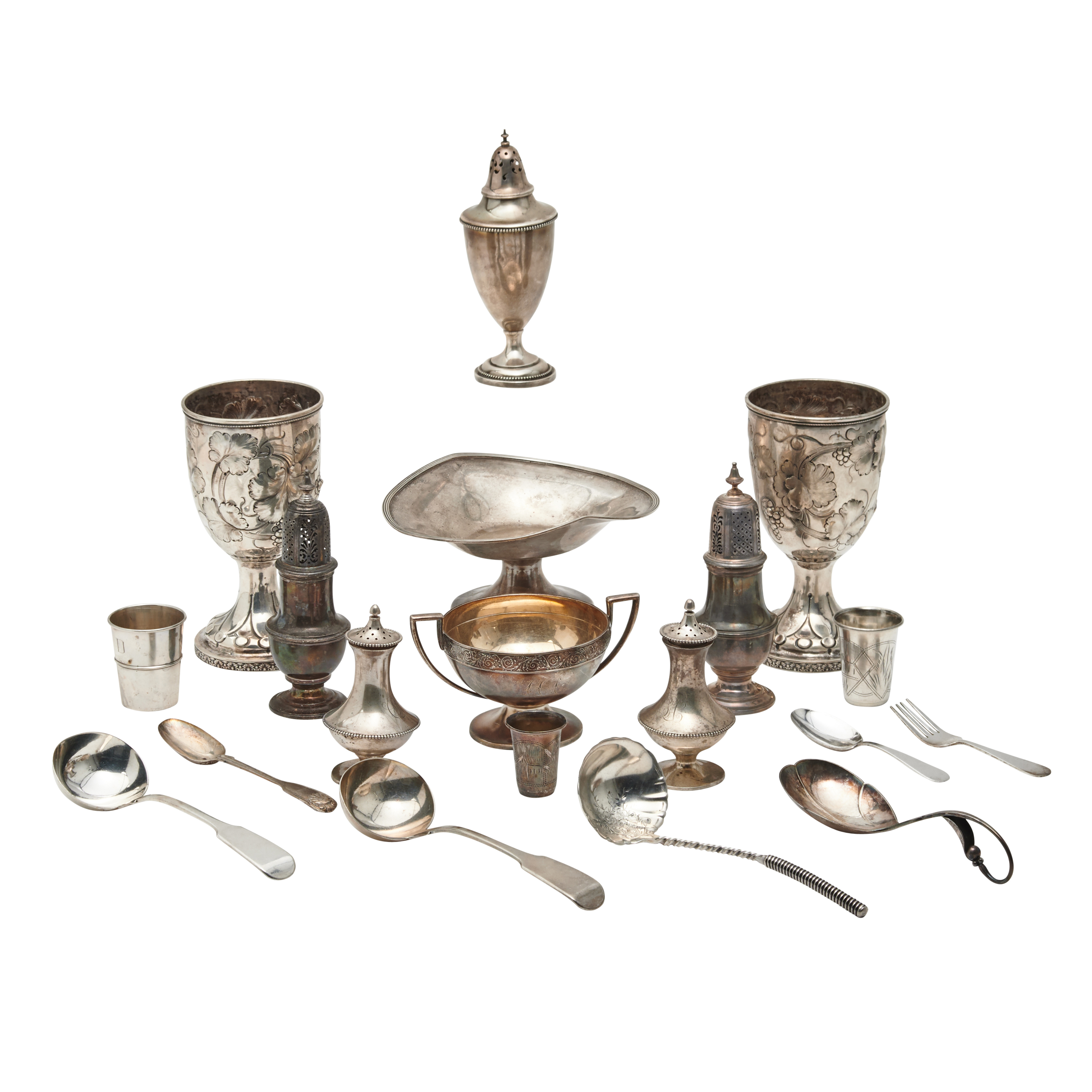 Comprising pair of unmarked chased goblets, 5 shakers including 2 English, International compote, Gorham gilt-wash open sugar bowl, Reed Barton shot cup, 2 Russian .84 silver engraved shot cups, pair of English silver ladles, baby spoon and fork, Whiting engraved ladle, Georg Jensen serving spoon, 1 English teaspoon.