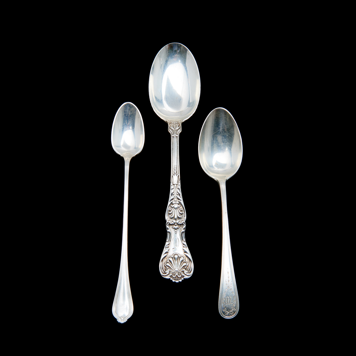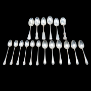 Comprising 2 Birks tablespoons, 4 Gorham tablespoons, 1 Gorham tablespoon with monogram, 1 Gorham tablespoon with monogram, 2 tablespoons, 6 Gorham place spoons with monograms, 12 Towle iced spoons. (28 pieces total).
