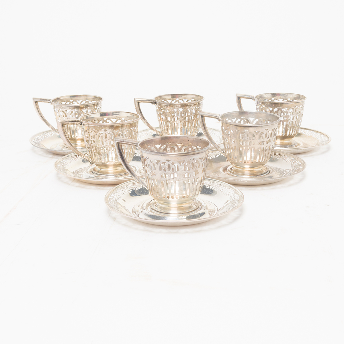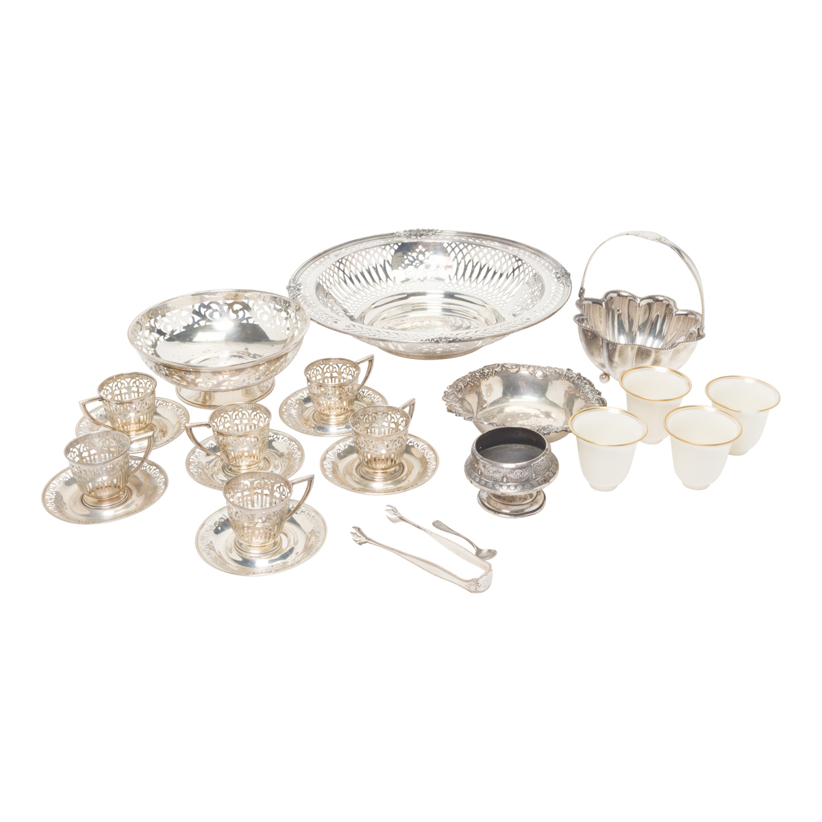 Comprising bowl with pierced rim and central monogram, Towle Woodside small lobed basket, smaller bowl with pierced rim and central monogram, small bowl with central mnonogram, six but dishes with pierced rims, salt cellar with spoon, sugar tongs, and six demitasse cups with Lenox porcelain inserts.