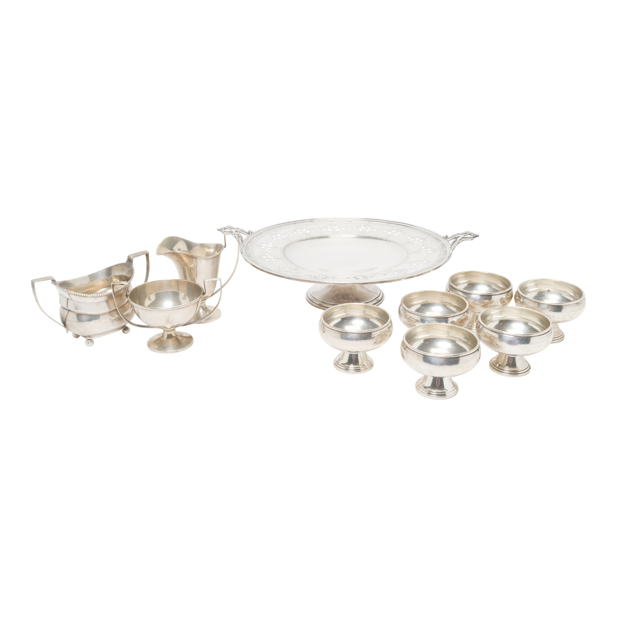 Comprising Towle footed serving tray with pierced edge and two handles, set of six small round footed bowls, Manchester Silver Co sugar and creamer pair, and additional sugar bowl.