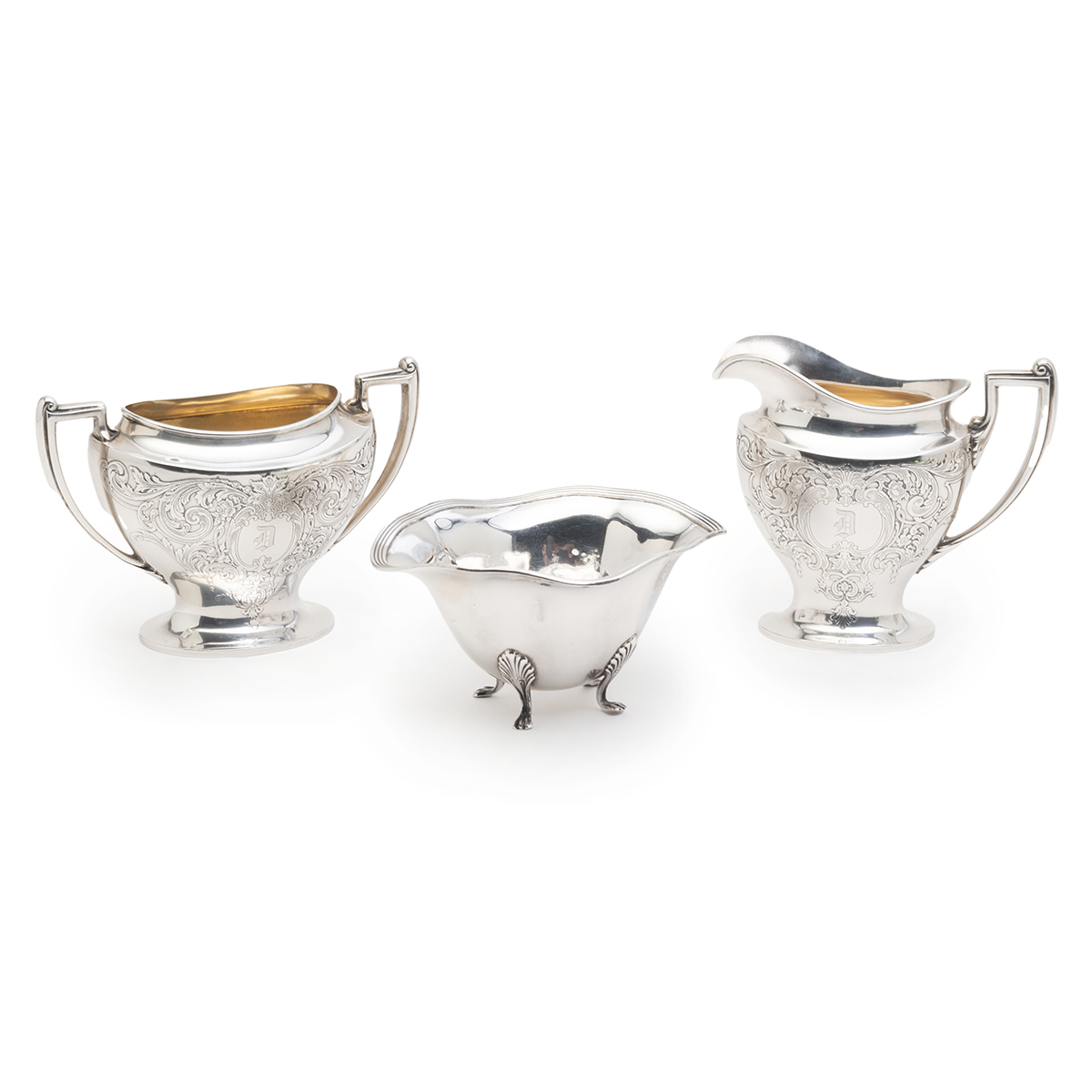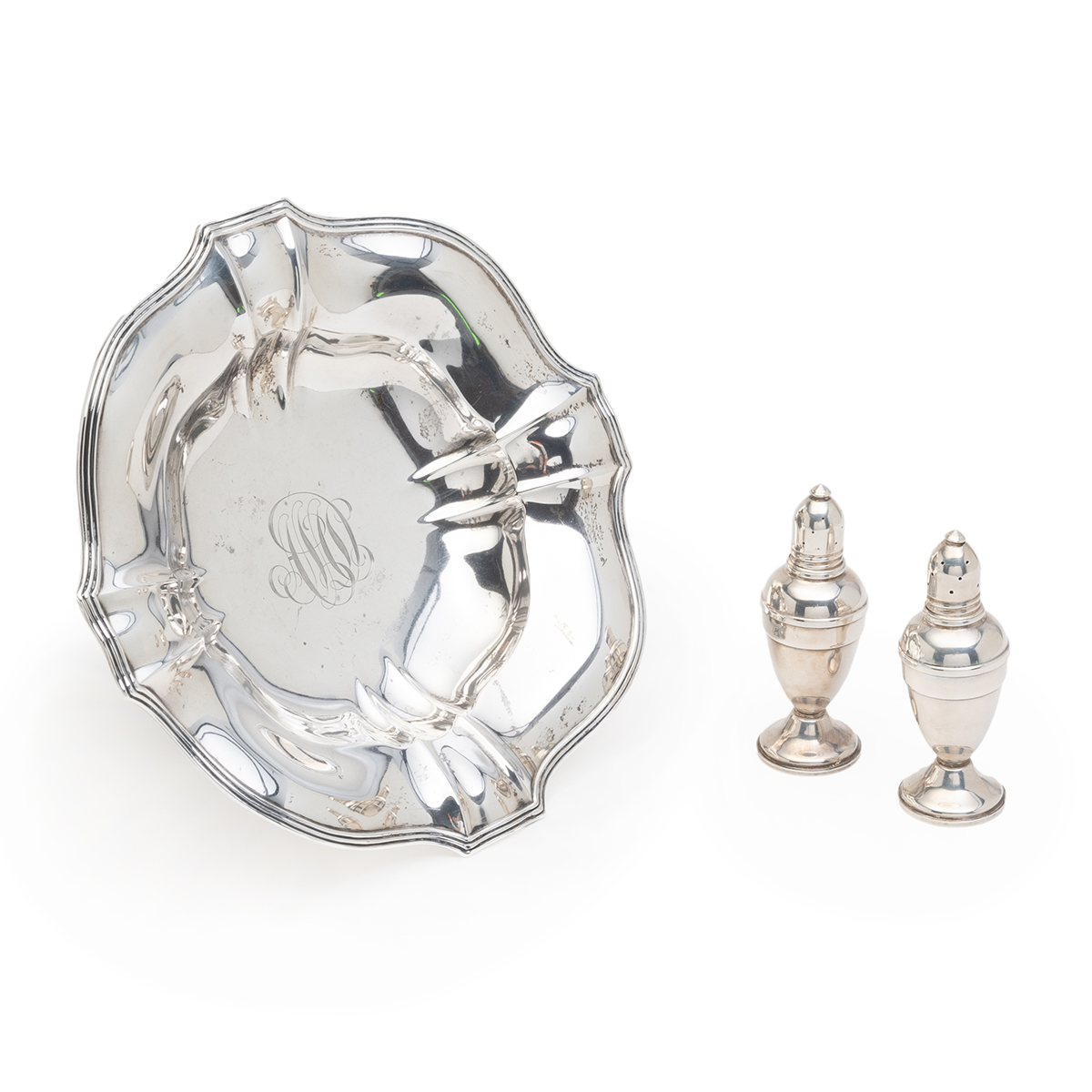 Comprising Gorham scalloped compote with central monogram, Wallace La Reine dish with central C monogram, Reed Barton cream and sugar pair with gilt wash interior, Watson small footed bowl with everted rim, pair of weighted sterling shakers with glass inserts.