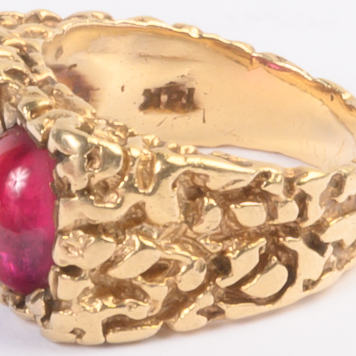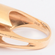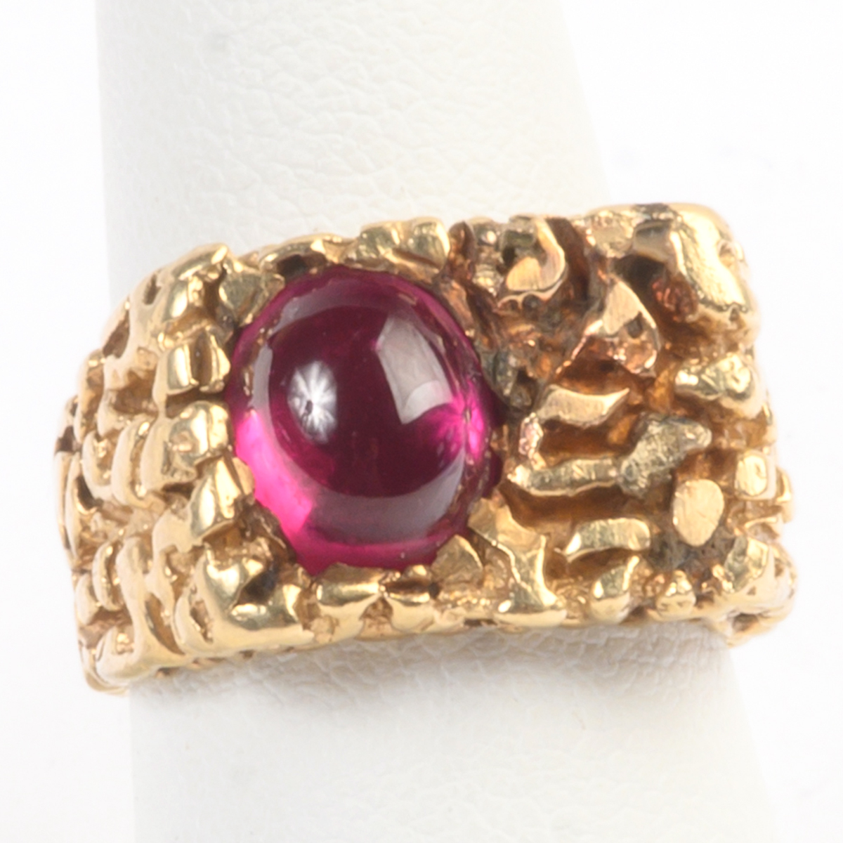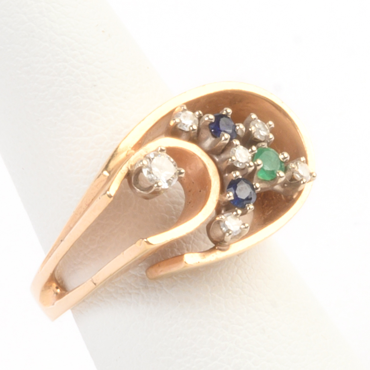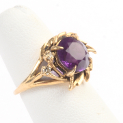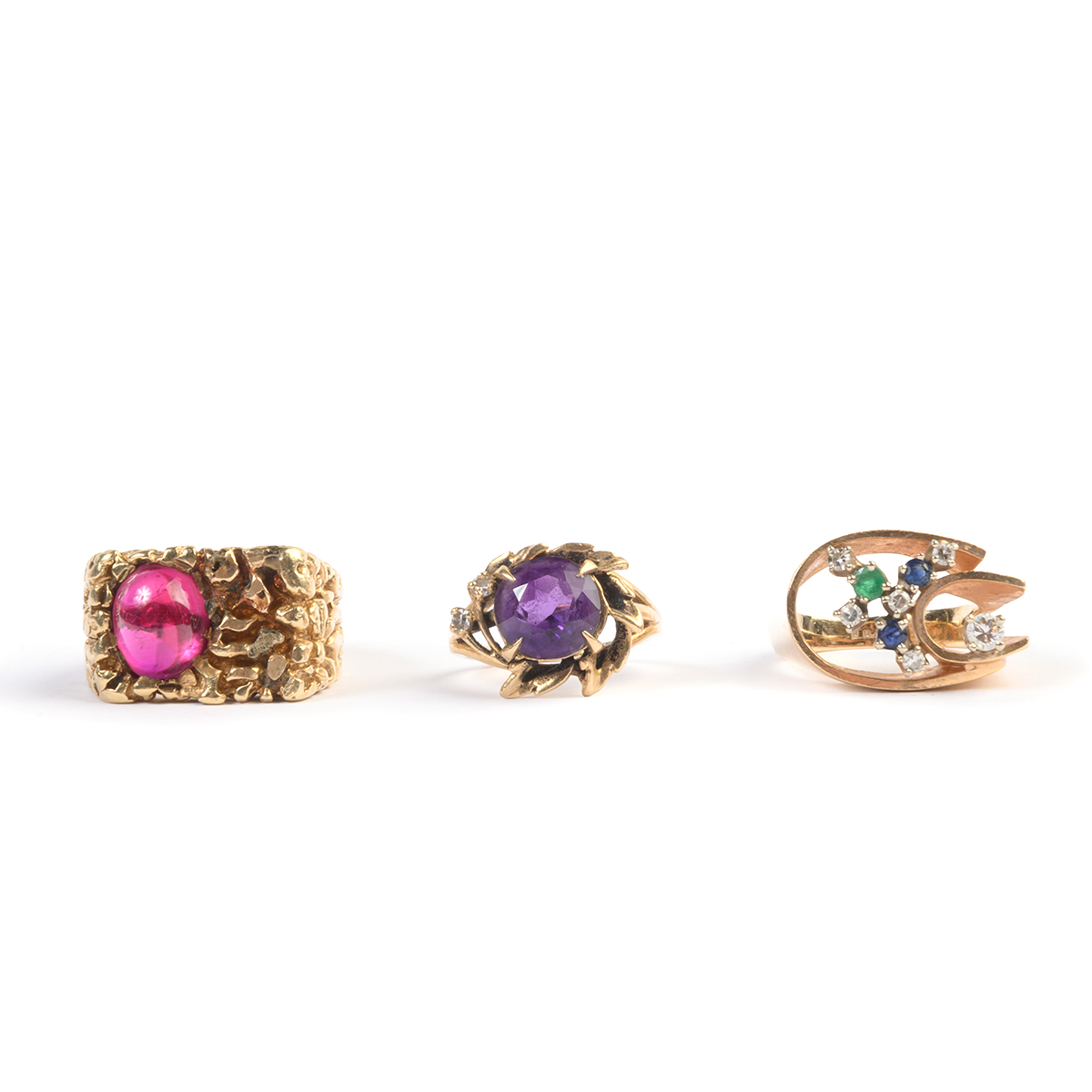 Including one diamond, sapphire, emerald, 14k yellow gold ring, size 5 1/2 one synthetic ruby, 14k yellow gold textured ring, size 7 3/4 together with one amethyst, diamond, 14k yellow gold ring,size 3 1/2.