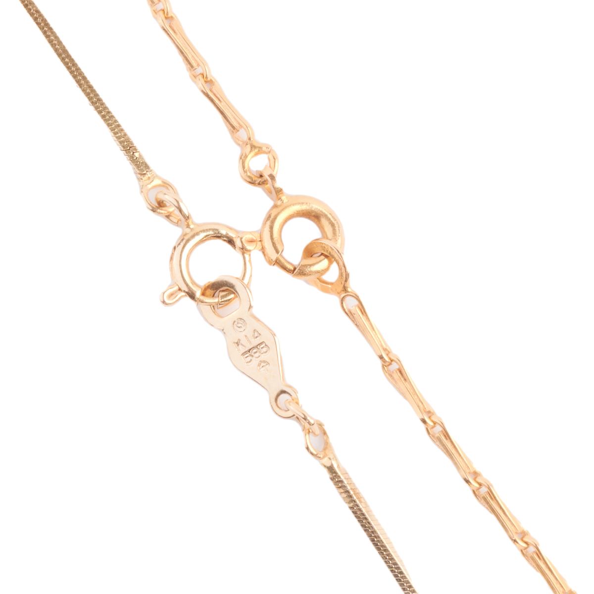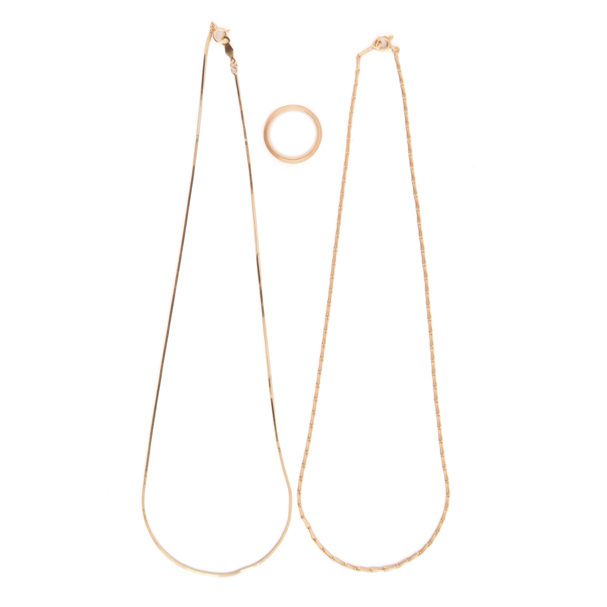 Including one 18k yellow gold fancy bar link, 16 inch necklace one 14k yellow gold 16 inch necklace together with a 14k yellow gold band, size 5 1/4.