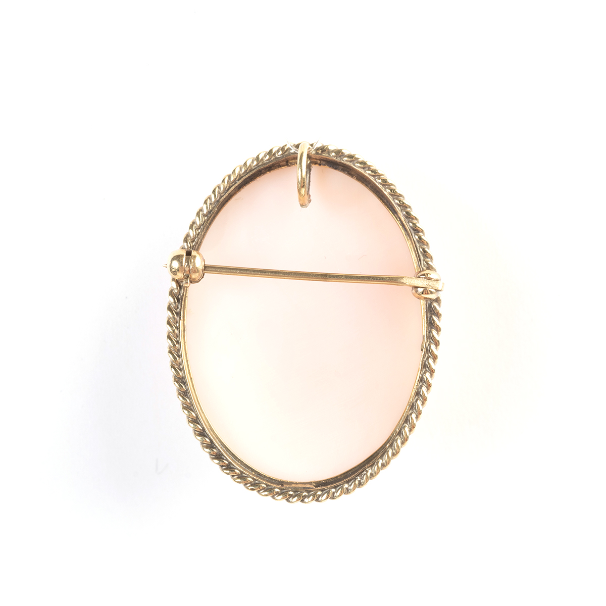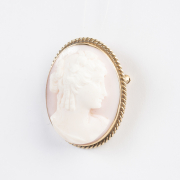 Featuring one conch shell cameo depicting the profile of a woman, set in a 14k yellow gold pendant brooch mounting measuring approximately 33 x 25 mm.