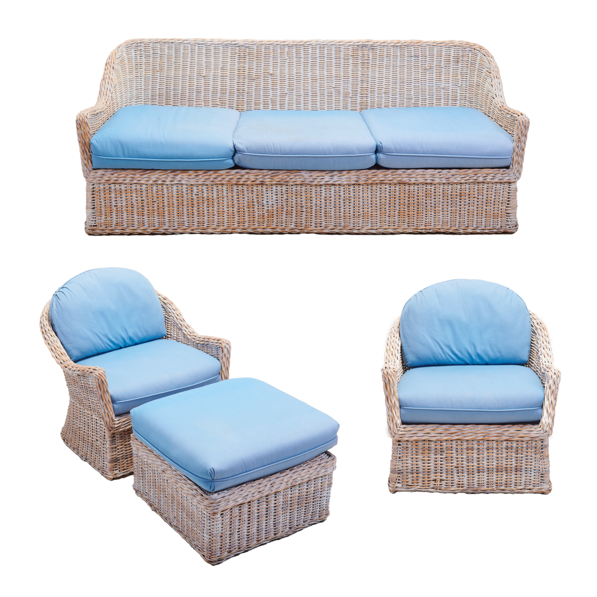 Bleached rattan wrapped bamboo frames, light blue upholstered cushions comprising sofa, two club chairs, and ottoman.