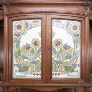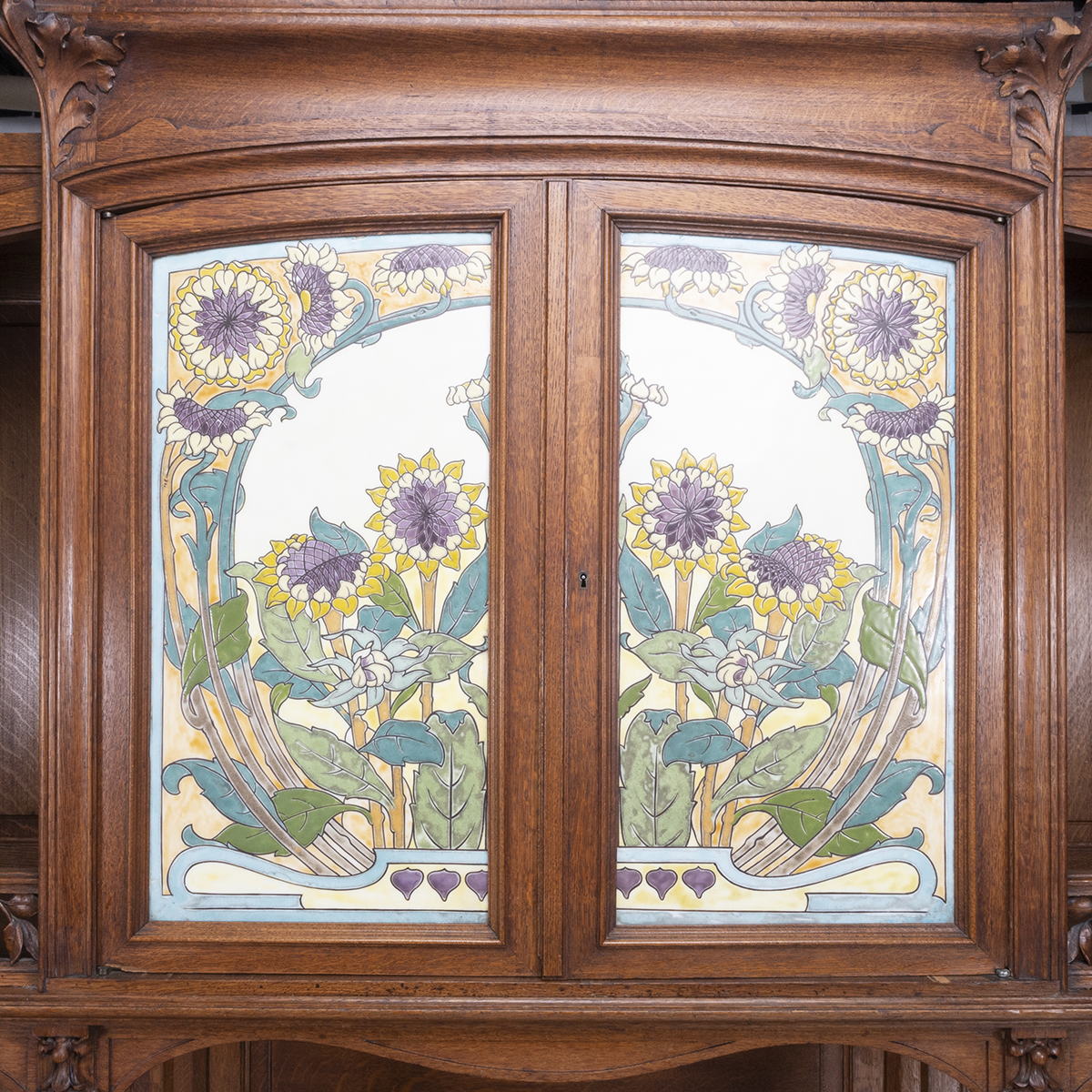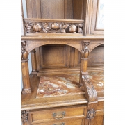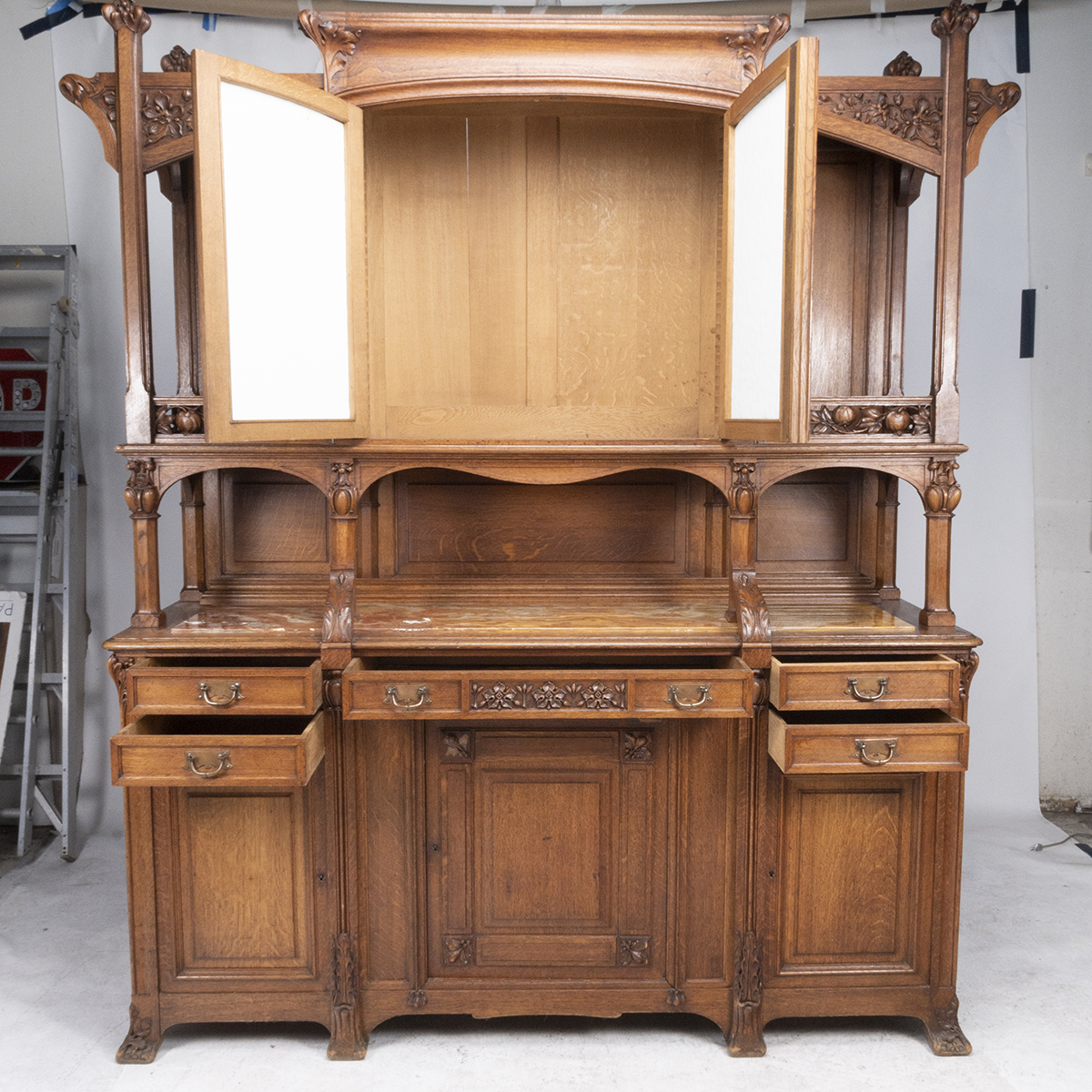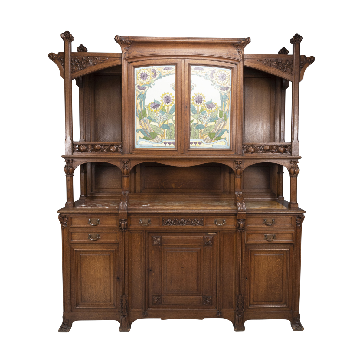The top with inset pictorial floral motif ceramic tiles to the central two door cabinet, flanked by galleried open spaces on either side the base with inset red and orange onyx to the to the open shelf space, central long drawers with two short drawers on either side, over a central single drawer cabinet flanked by single door cabinets on either side floral and foliate cravings throughout.