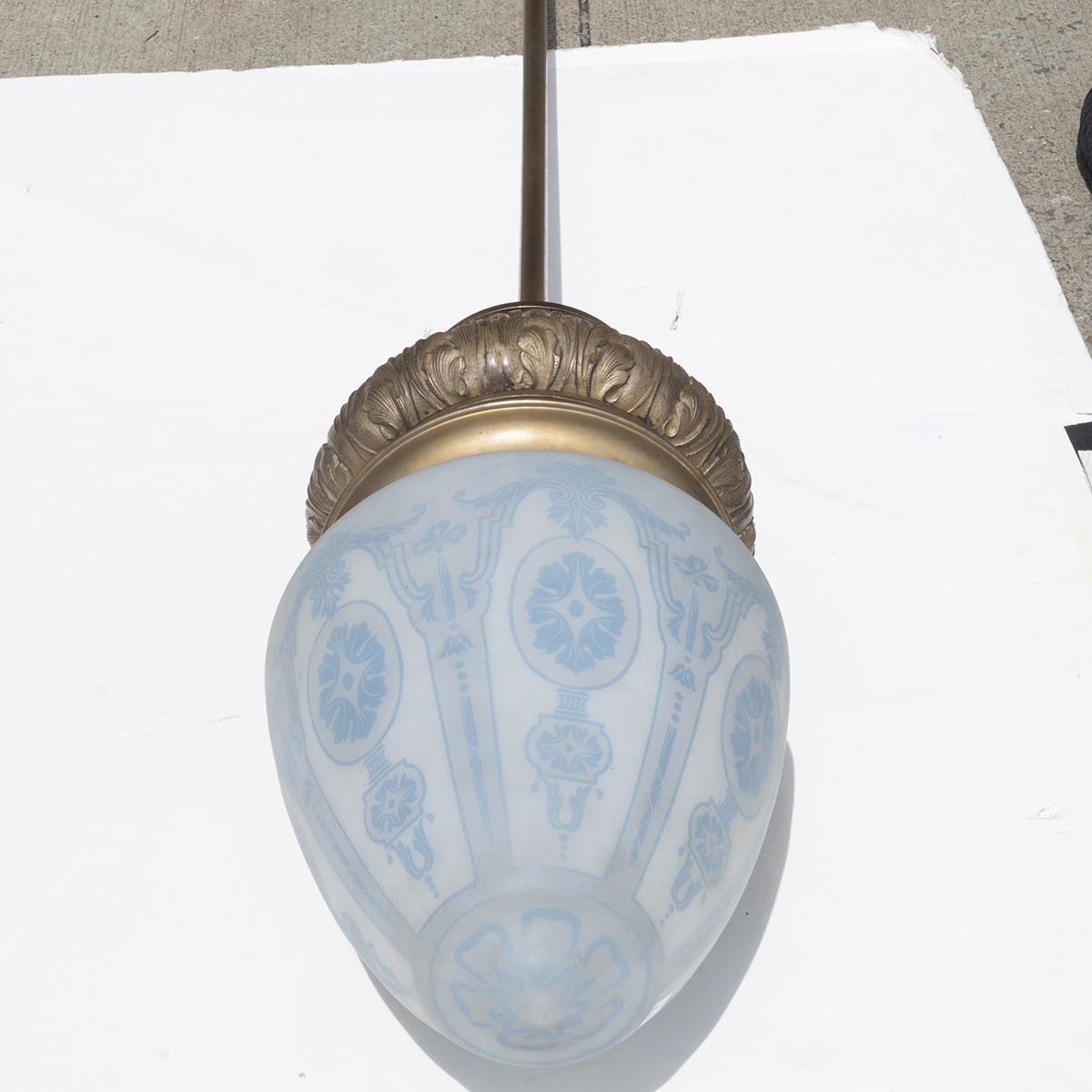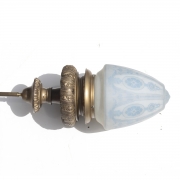 The brass body with long stem, amphora form shade with blue decoration on opaque glass.