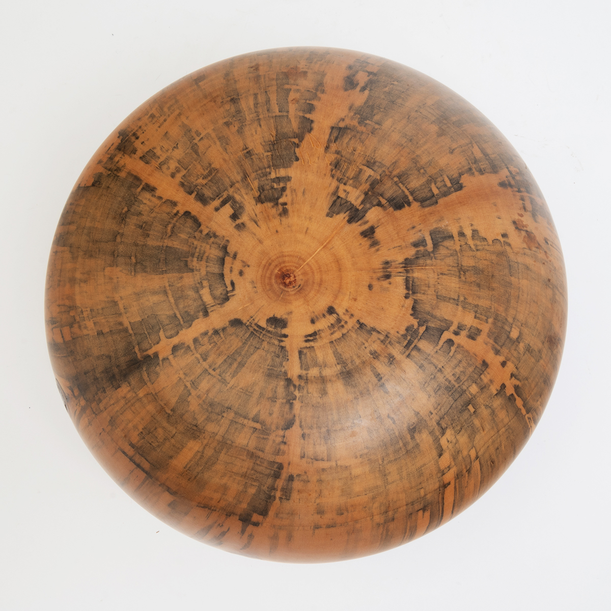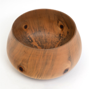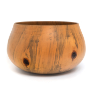 Condition: Minor surface wear. Two shallow scratch gauges to upper body. Apparent dark brown blotch stains to base in two spots. Some dark marks to rim. The pine branch nubs with some natural cracking and apparent resin seeping.