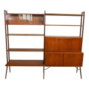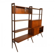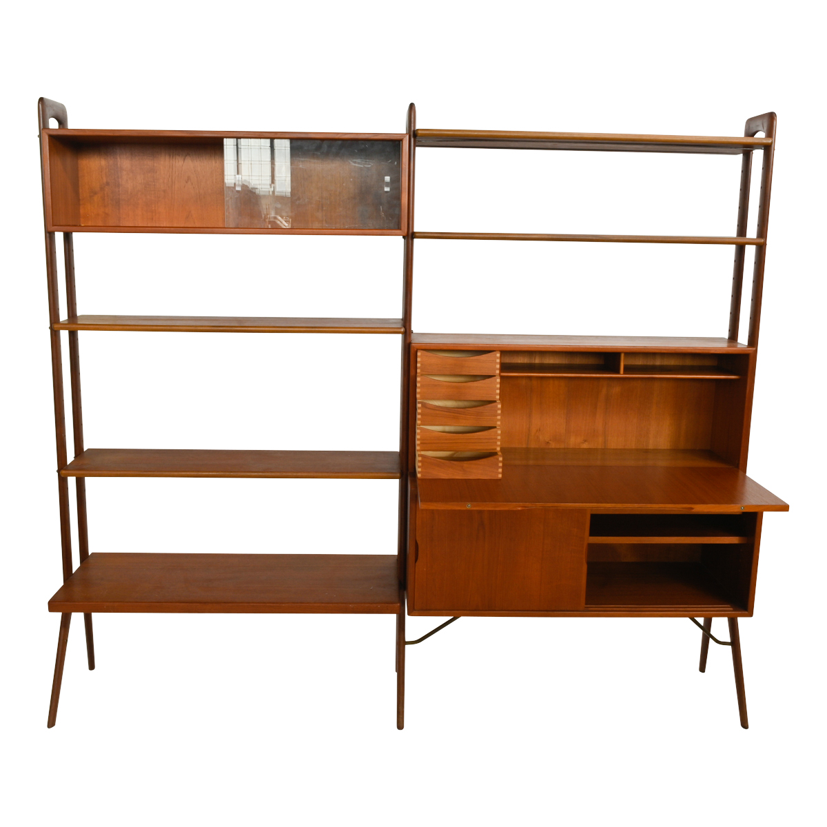 Attributed to Poul Cadovius (1911-2011) four open bookshelves, one double sliding glazed door shelf, the drop-front desk concealing shelves and storage spaces, over a sliding two door cabinet with shelves and drawer.