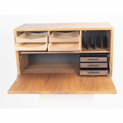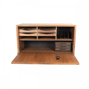 The interior with storage spaces and small drawers, key with round wood ball six total downward facing pegs to reverse likely for wall mounting.