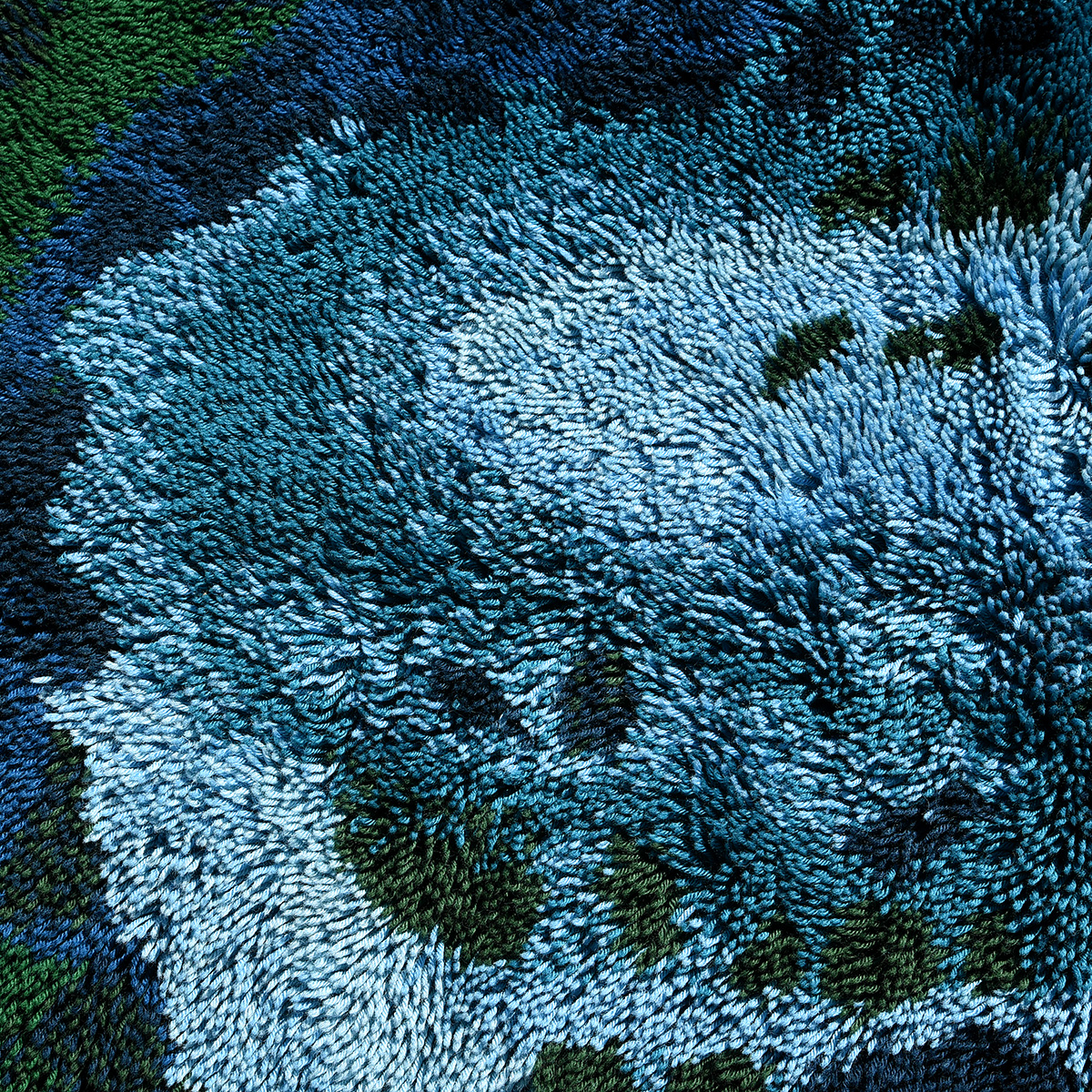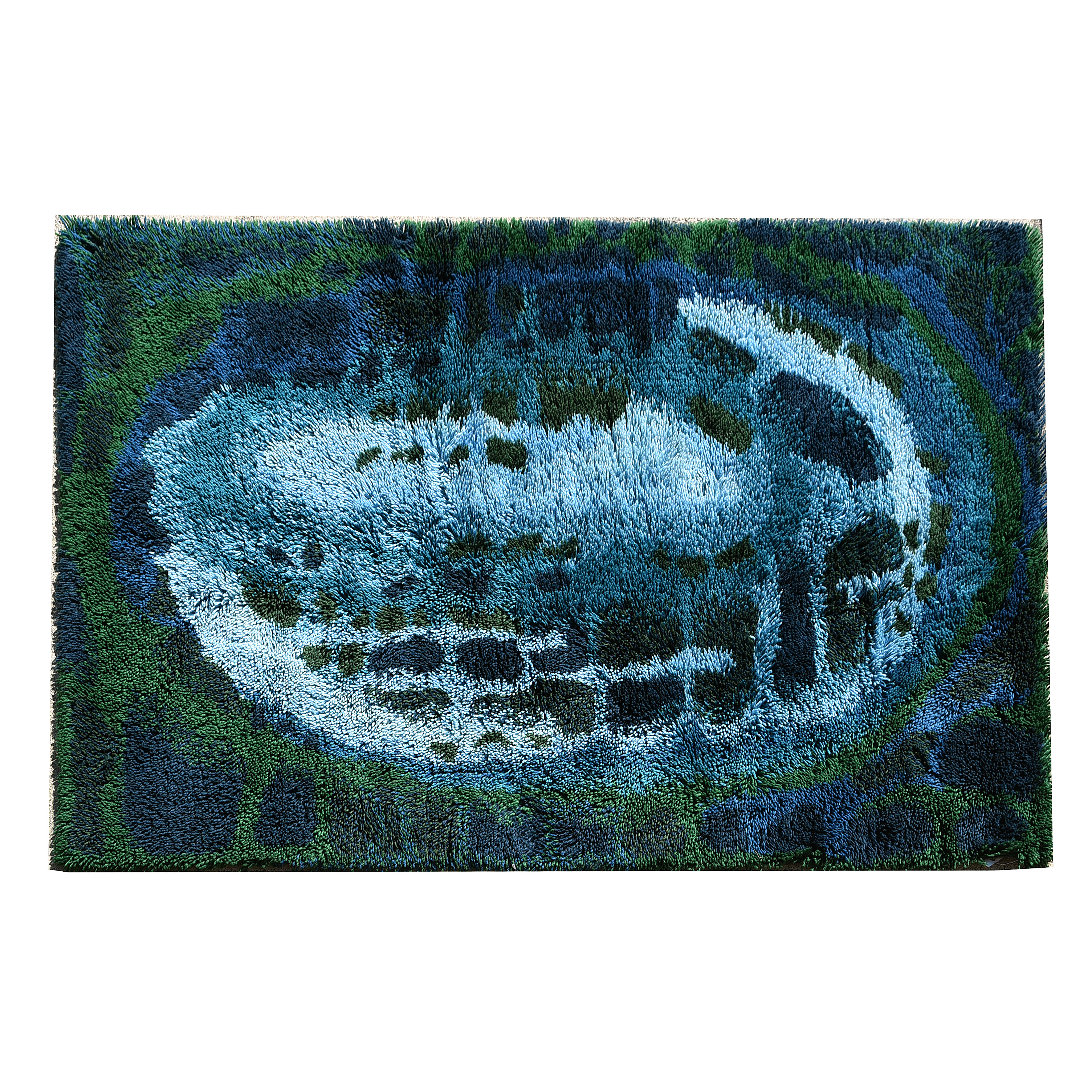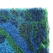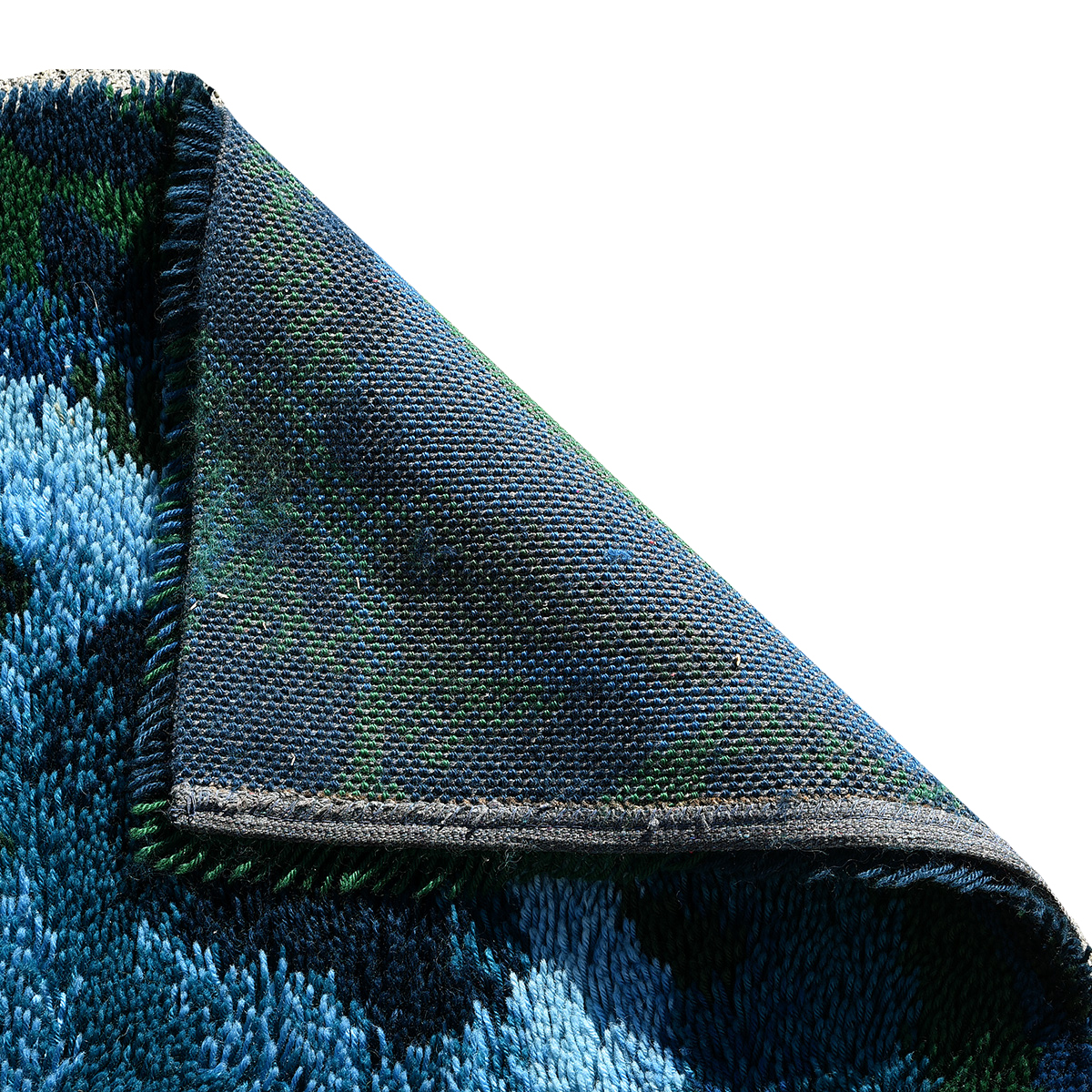 Woven with high pile, in a design of abstract swirls of blue, ombre to ivory, on a green ground.