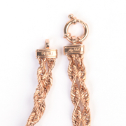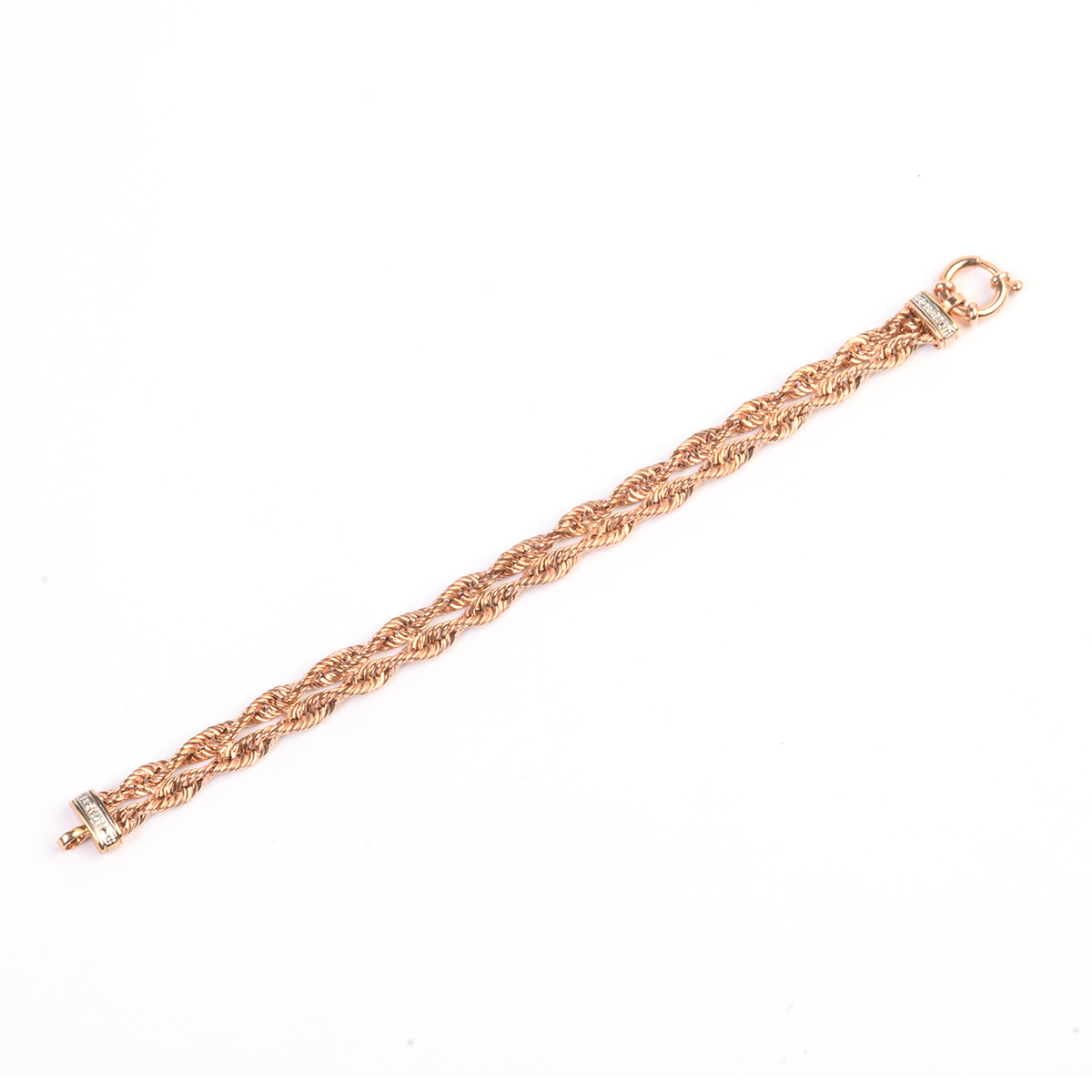 Featuring one single-cut diamond weighing 0.005 ct., set in a 14k rose gold double rope link mounting measuring approximately 8 mm in width, completed by a spring ring clasp, forming a 6 1/4 inch bracelet.