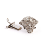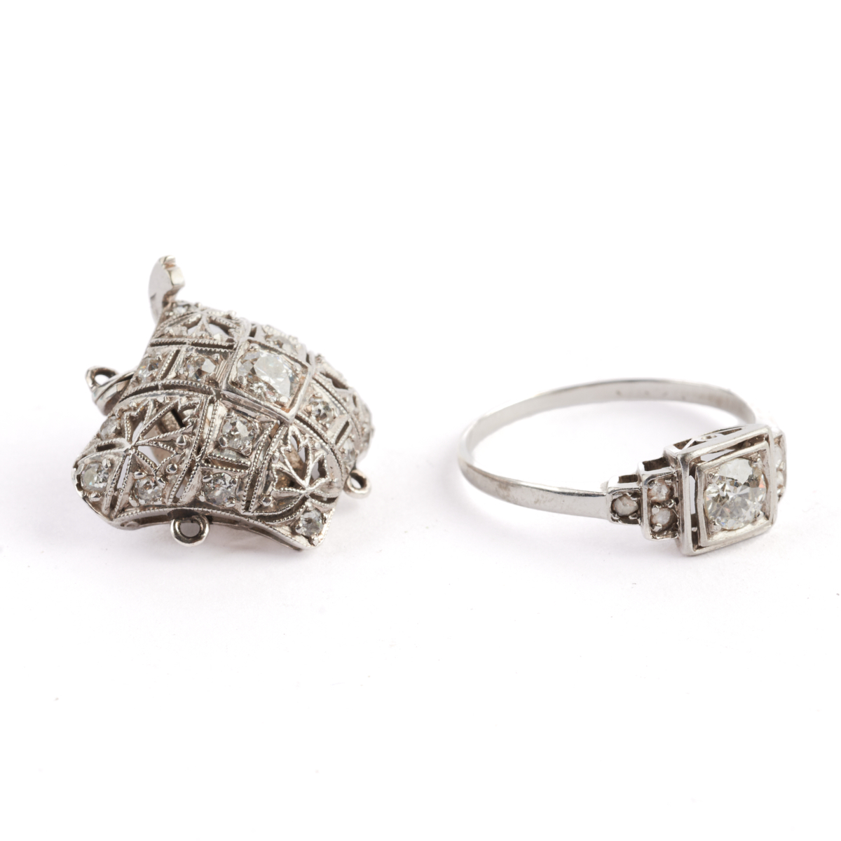 Including one diamond, 14k white gold tongue and groove clasp with four bails (two on each side) and measuring approximately 19 mm together with one diamond, 14k white gold ring, size 5 1/4.