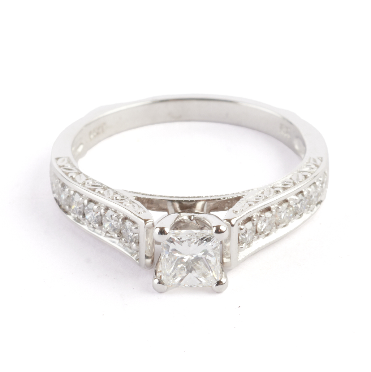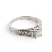 Featuring one princess-cut diamond weighing approximately 0.50 ct., accented by twelve full-cut diamonds weighing a total of approximately 0.20 cttw., set in a 14k white gold mounting.