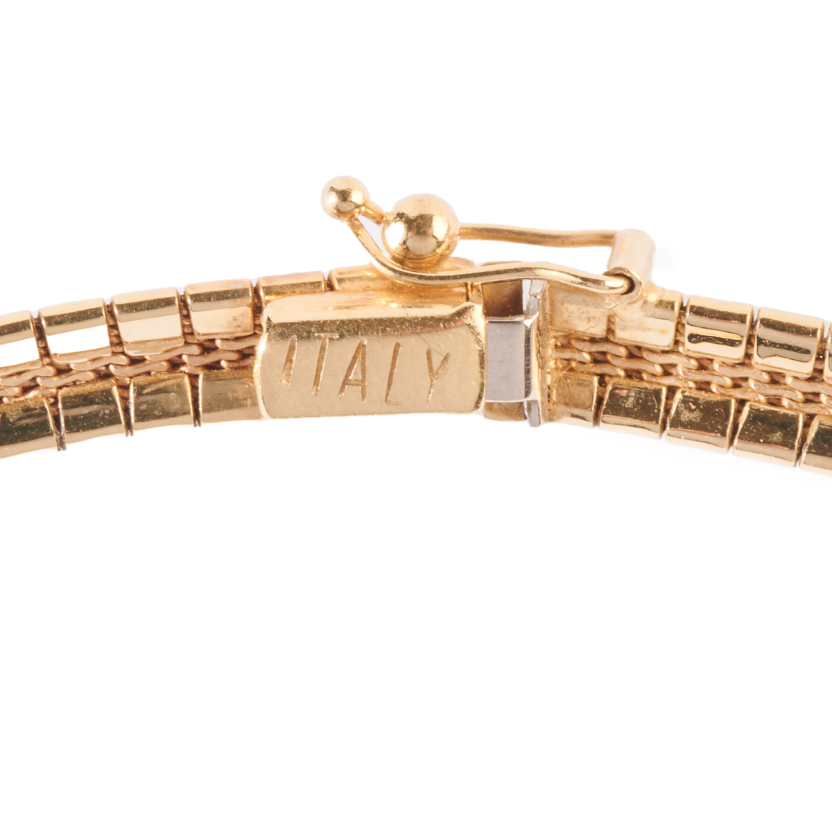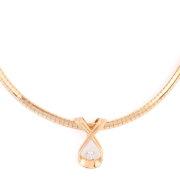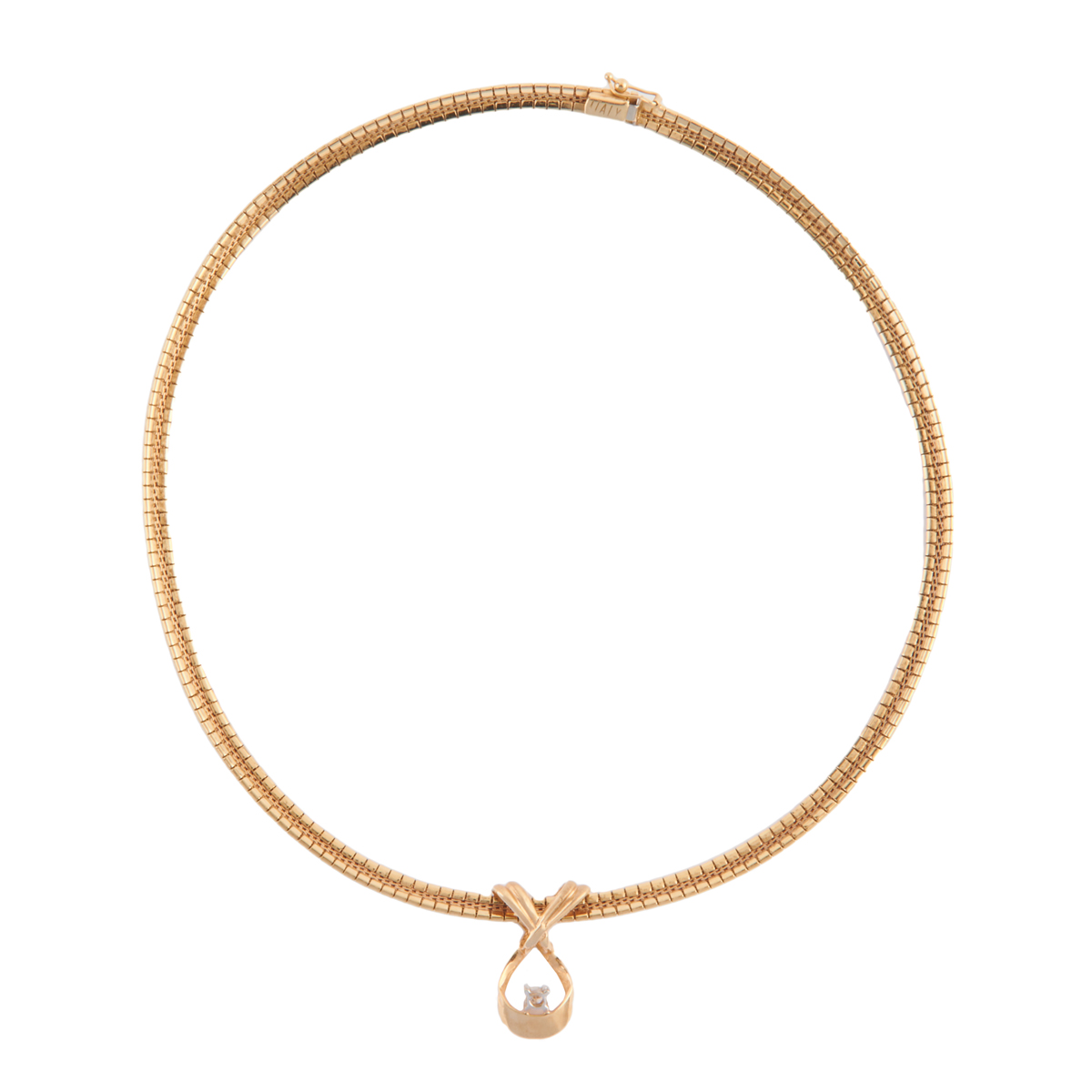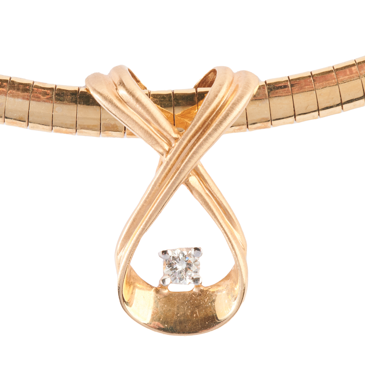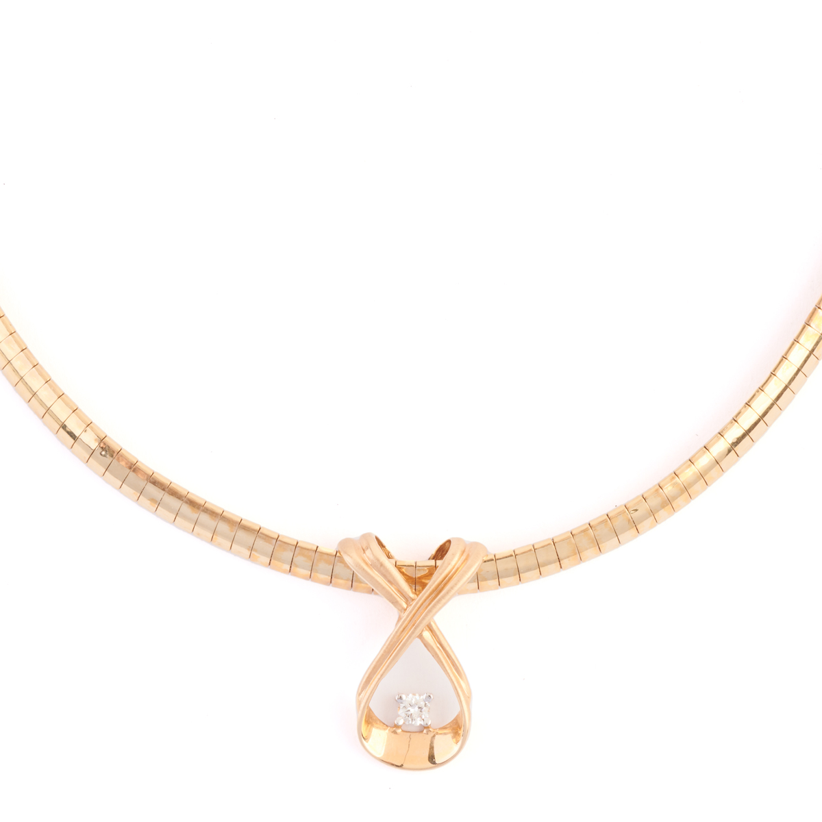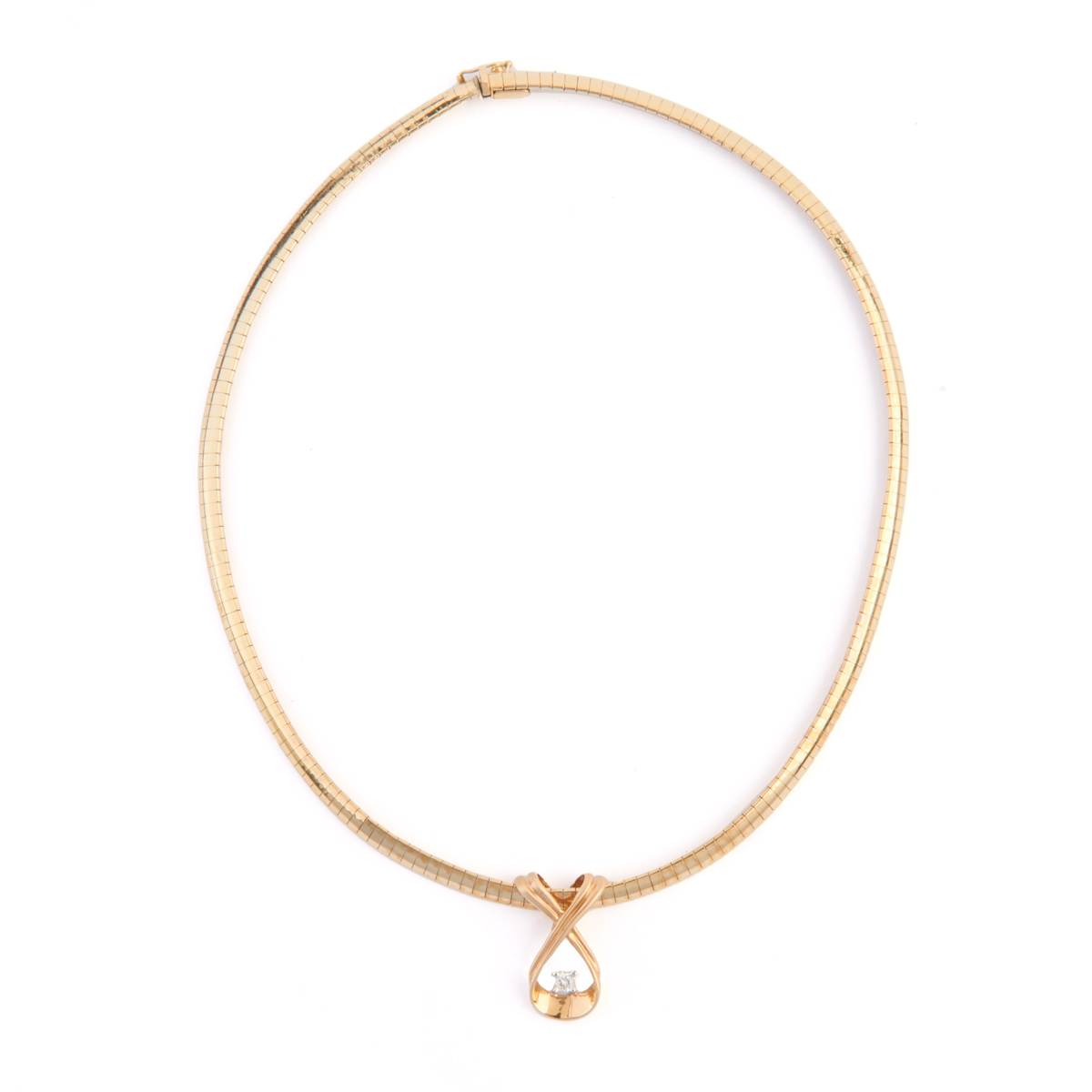 Featuring one full-cut diamond weighing approximately 0.15 ct., set in a 14k yellow gold crossover mounting measuring approximately 26 x 13 mm, suspended from a 14k yellow gold omega link chain, forming a 16 inch necklace.